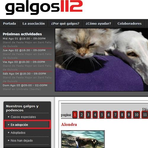 Selecciona 'En adopción' en la categoría 'Nuestros galgos y podencos' y echa un vistazo a los diferentes galgos y podencos que se encuentran en adopción.