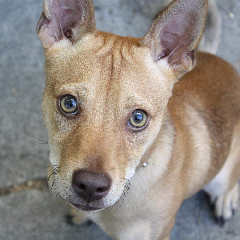 Luego dígale "¡mírame!" y suba el premio desde el hocico de su perro hasta su mejilla.