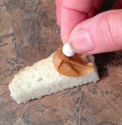 Pon la pastilla en el pedazo de pan que has untado, algunos productos que gustan mucho a los perros son la crema de cacahuete o nocilla, el paté también gusta mucho. Importante que presiones la pastilla y la hundas en la crema para que el perro no la vea.