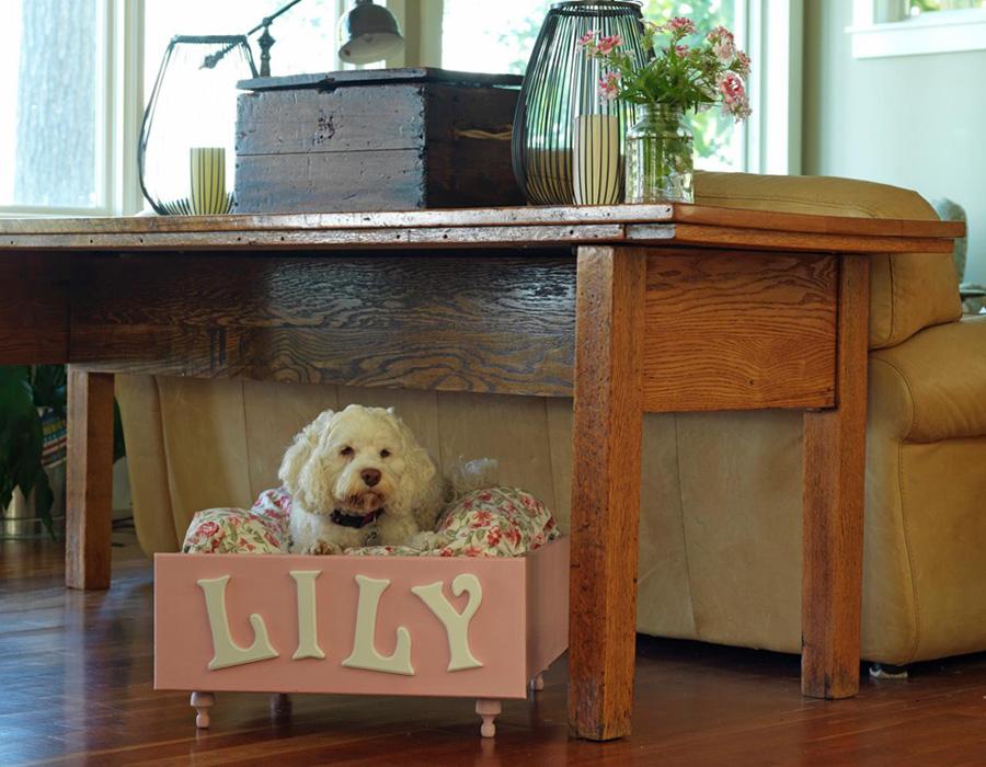 Si el acabado de la caja está bien, como mucho puedes pintar el nombre de tu mascota o pegar pegatinas decorativas. Si está algo deteriorado, tendrás que limar y pulir un poco para que no haya ninguna superficie rasposa, y puedes darle una mano de color con un toque de viejo. En este caso, para facilitar la movilidad puedes ponerle unas ruedas que soporten bien el peso de tu perro y que puedan bloquearse para que duerma. Después, solo te faltará poner unas mantas dobladas dentro como lecho, o hacer tu propio colchón con una funda vieja bien rellena de tela para que esté mullido.