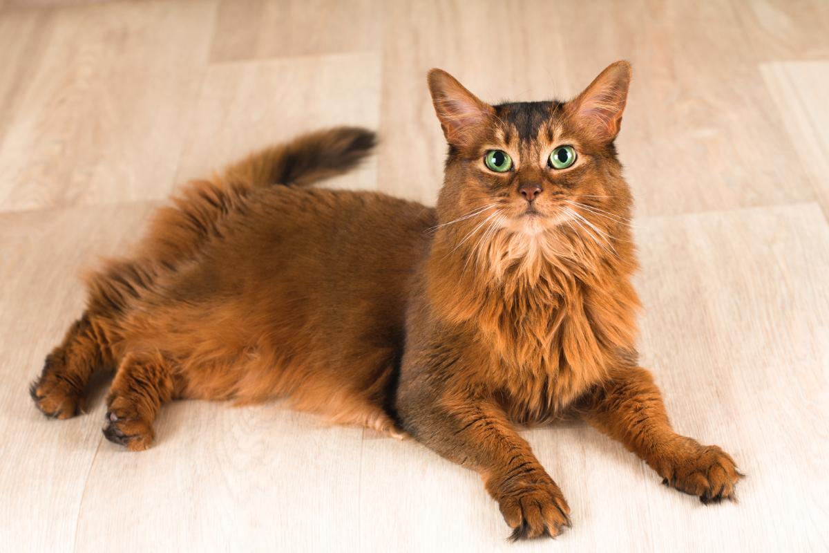 El gato somalí luce un manto semilargo con el ticking, un rasgo único de la raza. Cada pelo tiene tres bandas o más de colores oscuros, intercaladas con otras más claras. Estos felinos son de cuerpo atlético, esbeltos, les encanta pasar el rato dando saltos y trepando al aire libre por el jardín, por ejemplo. Son muy inteligentes y no toleran bien pasar demasiado tiempo solos.