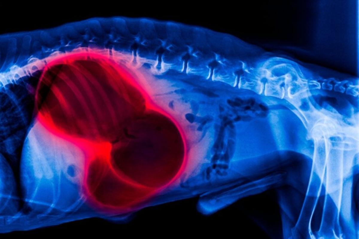 Es bastante frecuente en perros adultos de tamaño grande, generalmente después de comidas copiosas y seguidas de ejercicio, juego, carreras o saltos. El estómago repleto de comida, produce pocas movimientos musculares para la correcta digestión por su excesivo llenado, pesa mucho y cuelga más en el abdomen y se comienza a generar más gas por la fermentación del alimento. En un momento dado, favorecido por el movimiento del perro, se gira sobre sí mismo. En este momento los vasos que lo irrigaban quedan estrangulados y el estómago deja de recibir sangre o recibe mucha menos. Sin embargo, la cantidad de gases dentro sigue aumentando. Este problema se diagnostica con una ecografía o radiografía y hay que tener en cuenta que esta situación acaba con la vida del animal si no se realiza una cirugía rápidamente.