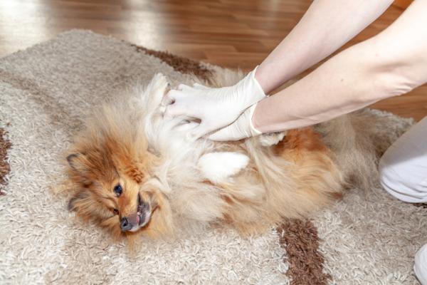 - Manteniendo al perro de pie busca la boca de su estómago, que se encuentra en la parte baja y central de las costillas, justo donde acaba el esternón y se nota un leve hueco.