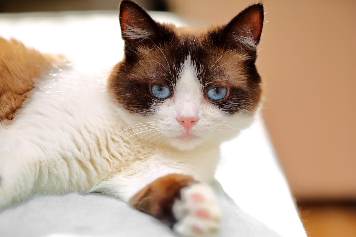 Se llama así por sus patas blancas. Es una raza gatuna de ojos azules grandes y con un pelaje de tono beige, tostado o blanco. El origen del snowshoe se remonta a la década de 1960 como resultado de la mezcla entre el siamés y varios gatos americanos de pelo duro.