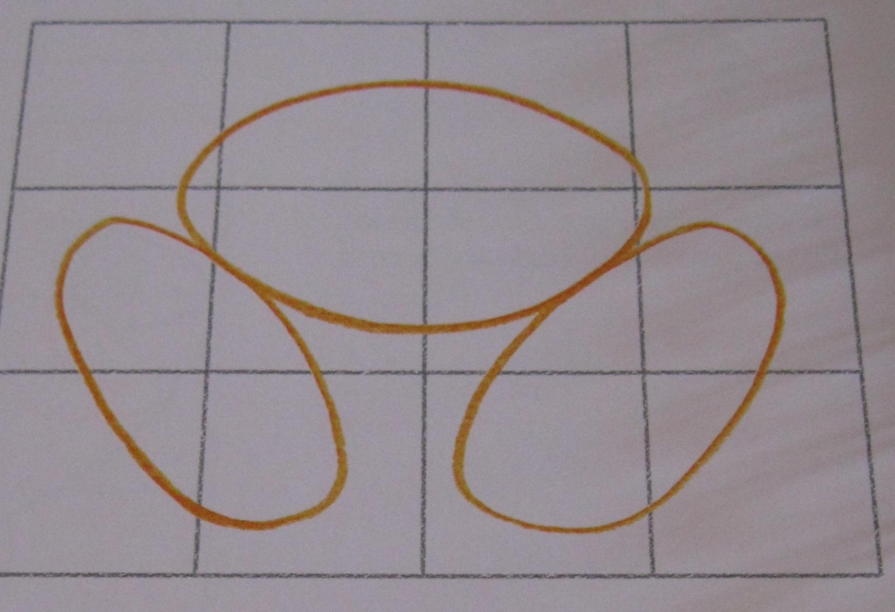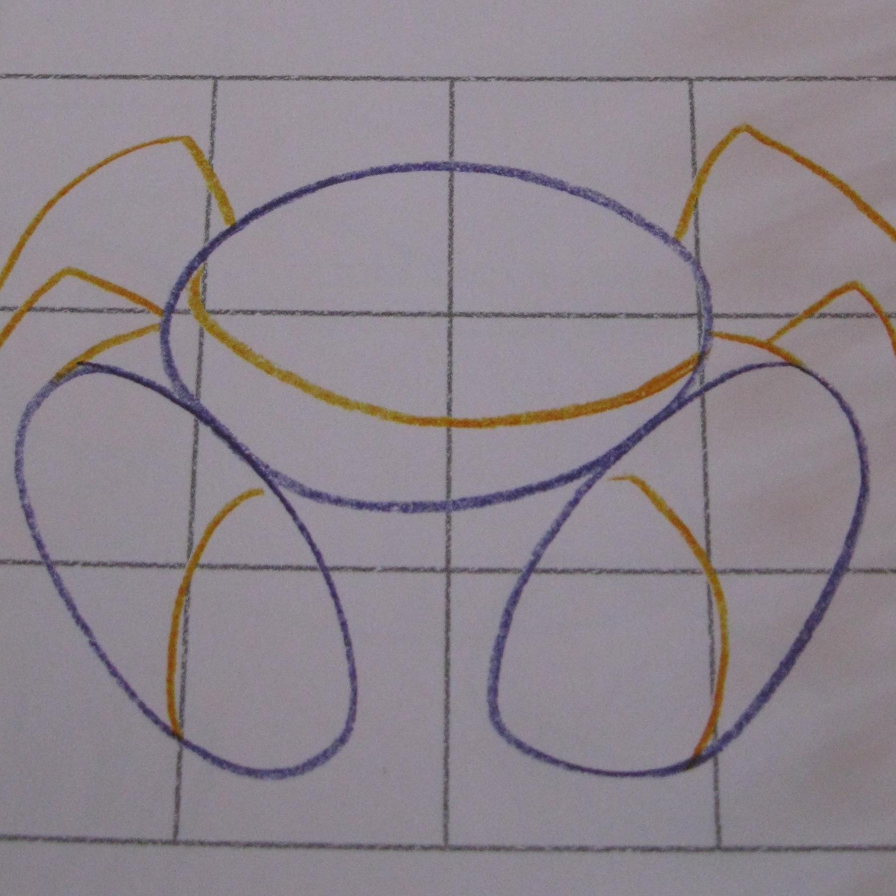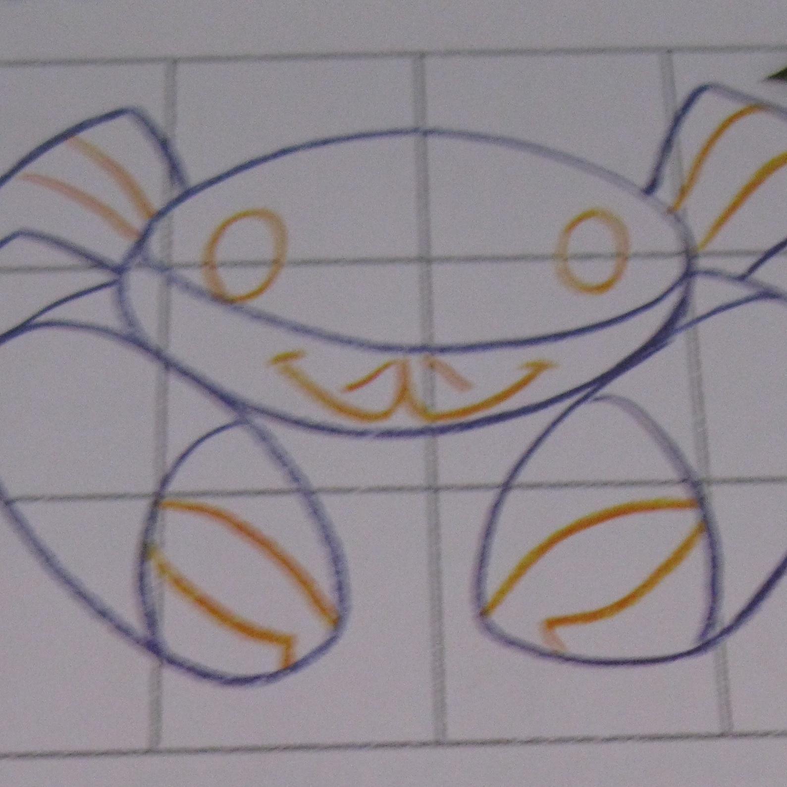 Dibuja una cuadrícula de 4 cuadrados iguales y 3 verticales. Dibuja un óvalo para el cuerpo del cangrejo. Traza luego dos formas ovales puntiagudas hacia abajo y hacia el centro de la cuadrícula. Serán las pinzas.