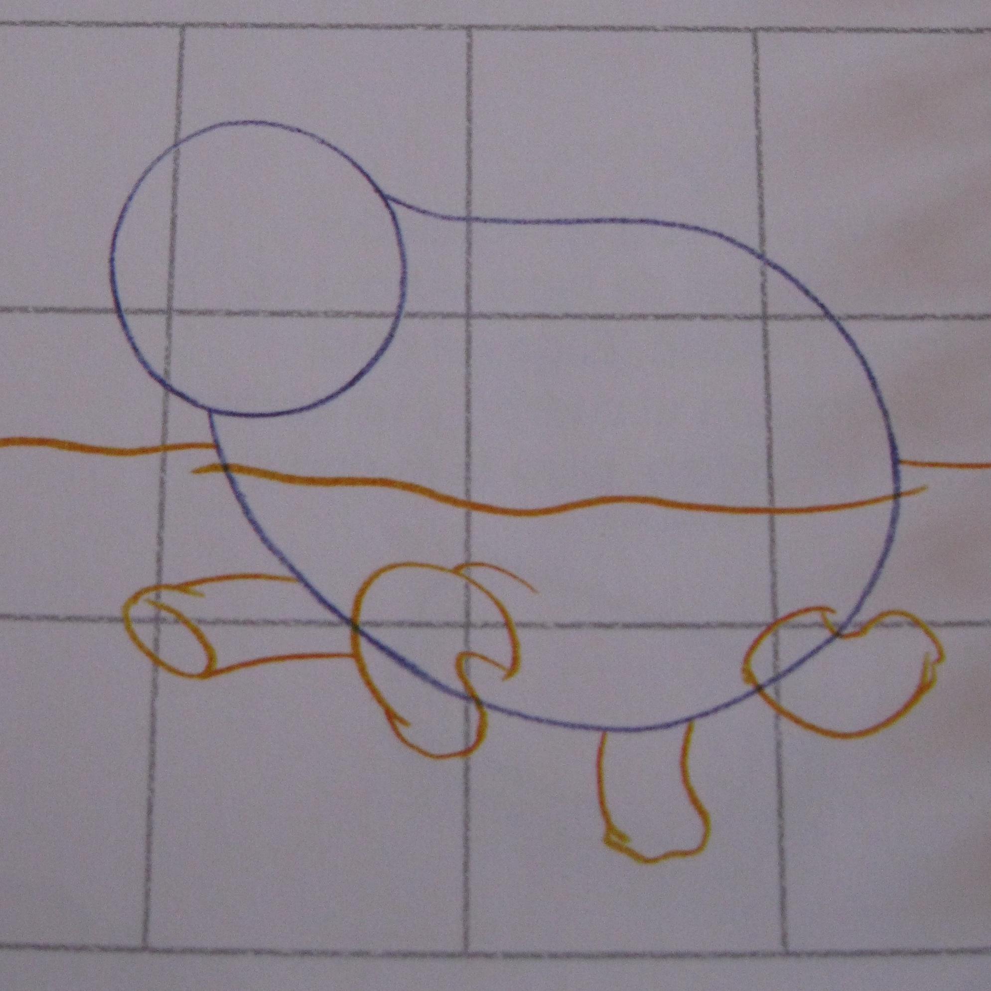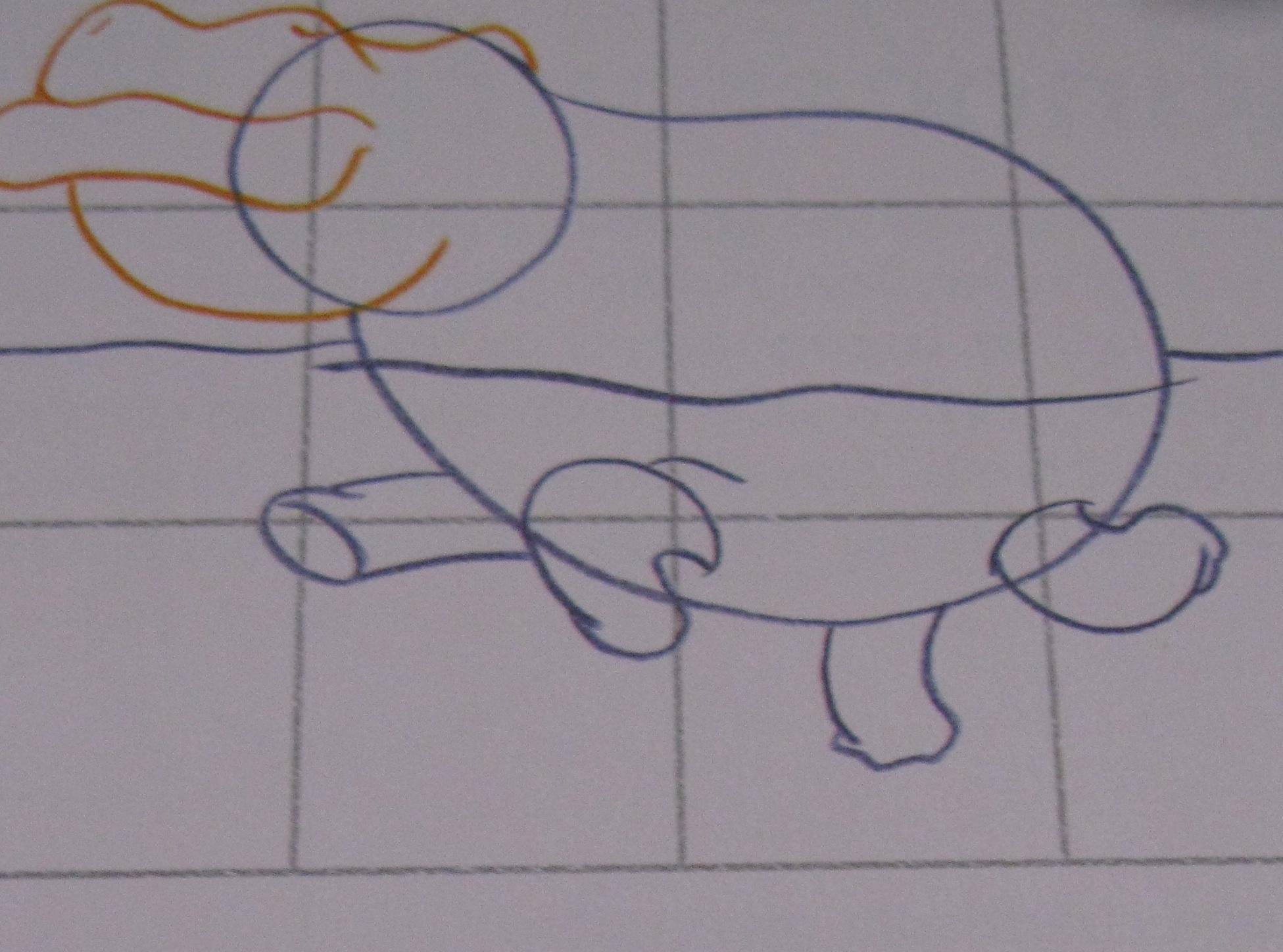 Dibuja una cuadrícula con cuatro cuadrados horizontales y tres verticales. Traza primero el círculo de la cabeza. Añade la forma del cuerpo. Asegúrate de que la forma del cuerpo del hipopótamo está bien antes de pasar al siguiente paso.