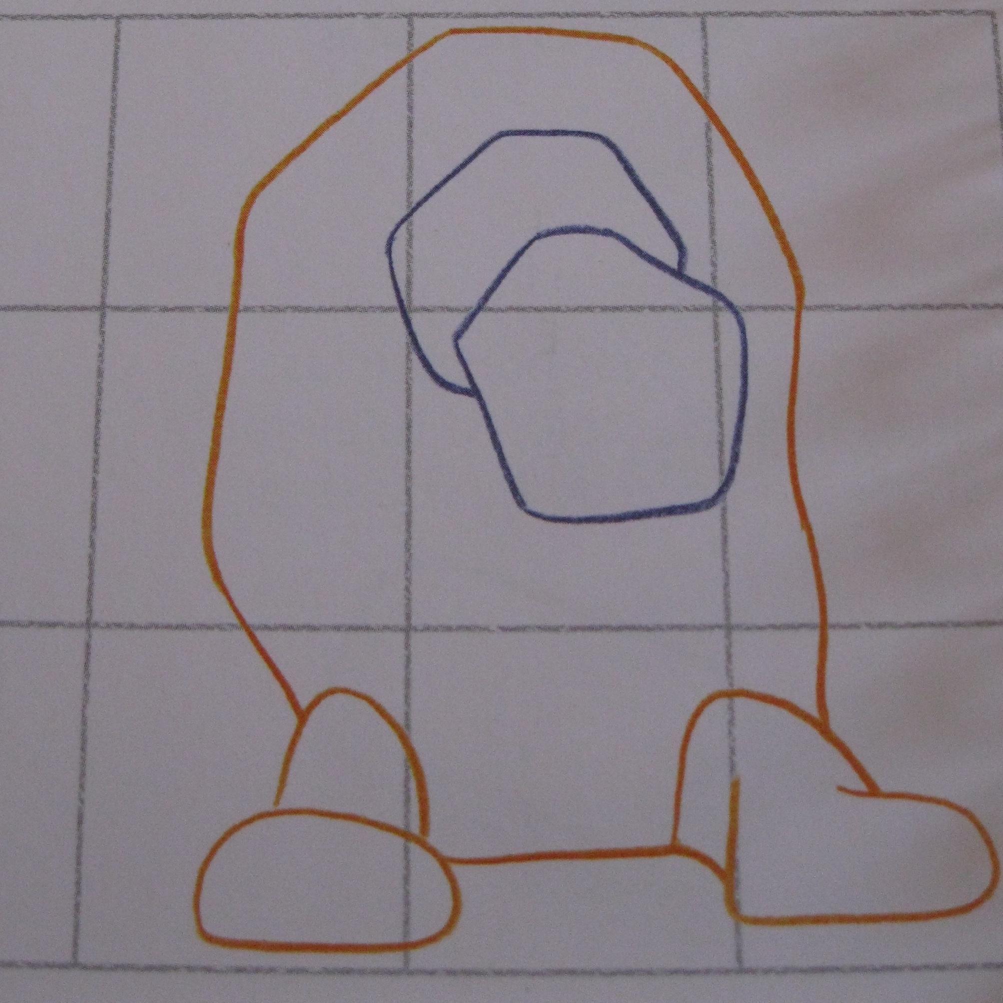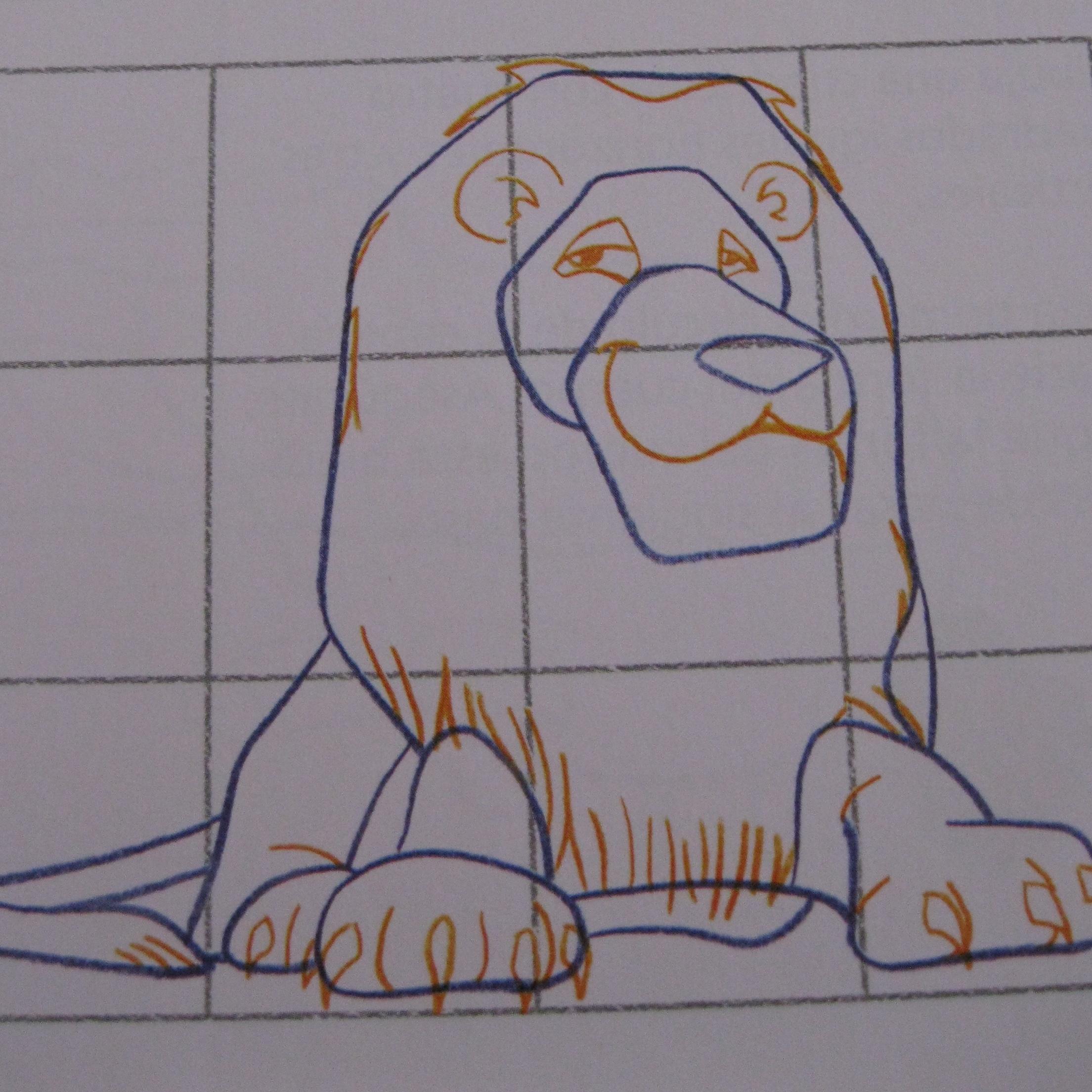 Dibuja una cuadrícula con cuatro cuadrados horizontales y tres verticales. Comienza dibujando la forma del hocico. Añade por detrás una forma similar para la cabeza. Comprueba que tu dibujo está colocado correctamente en la cuadrícula.