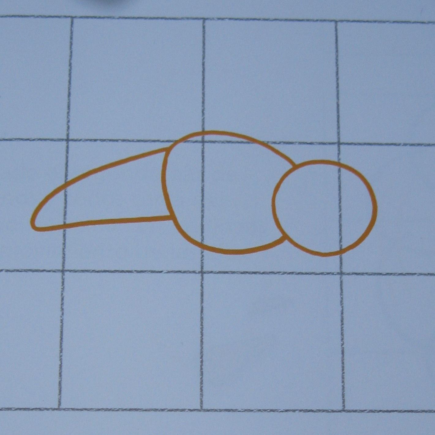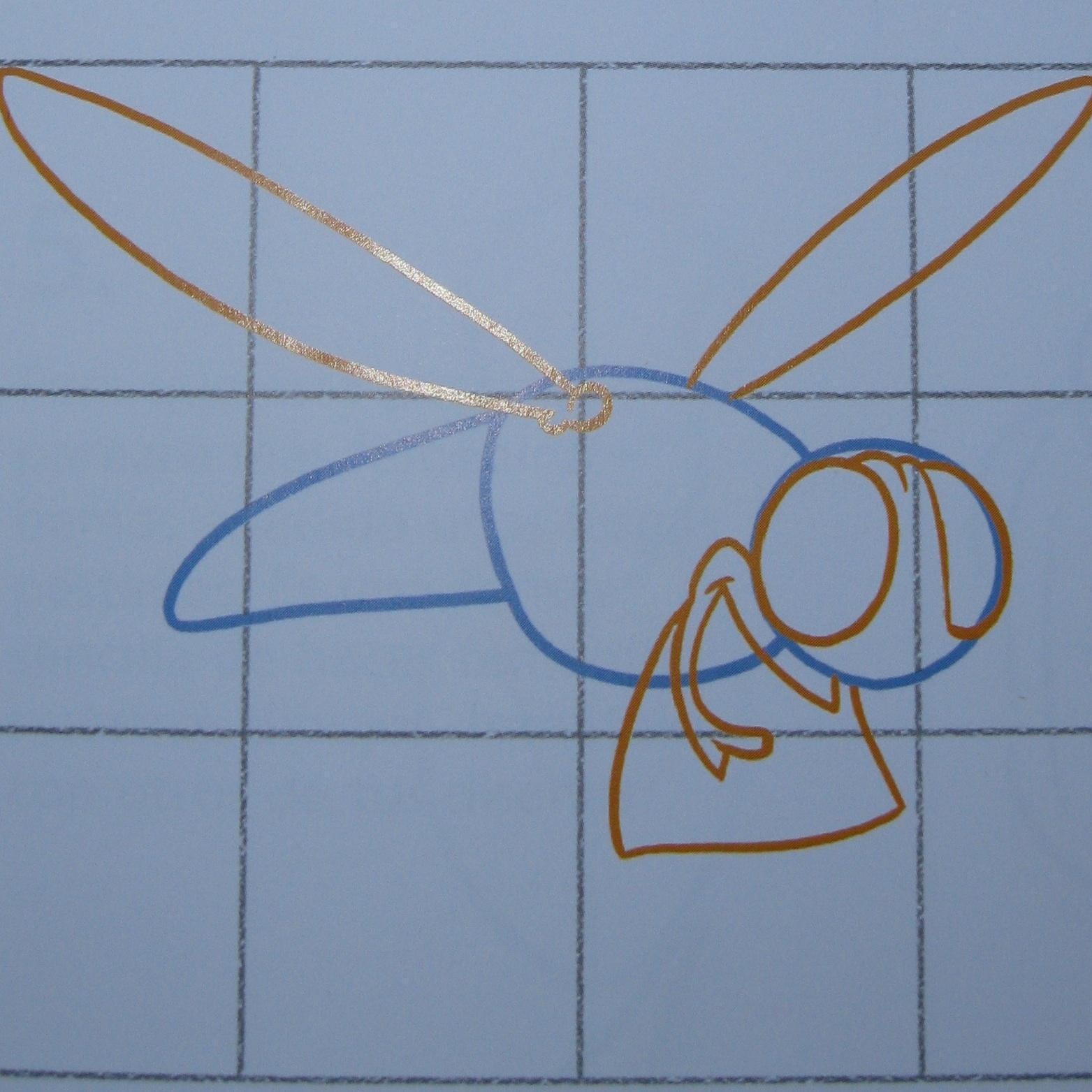 Comienza dibujando una cuadrícula con cuatro cuadrados iguales horizontales y tres verticales. A continuación esboza la forma de la cabeza, el cuerpo y la cola del mosquito. Comprueba que todas las líneas del dibujo están en el sitio correspondiente de la cuadrícula y avanza hasta el siguiente paso.