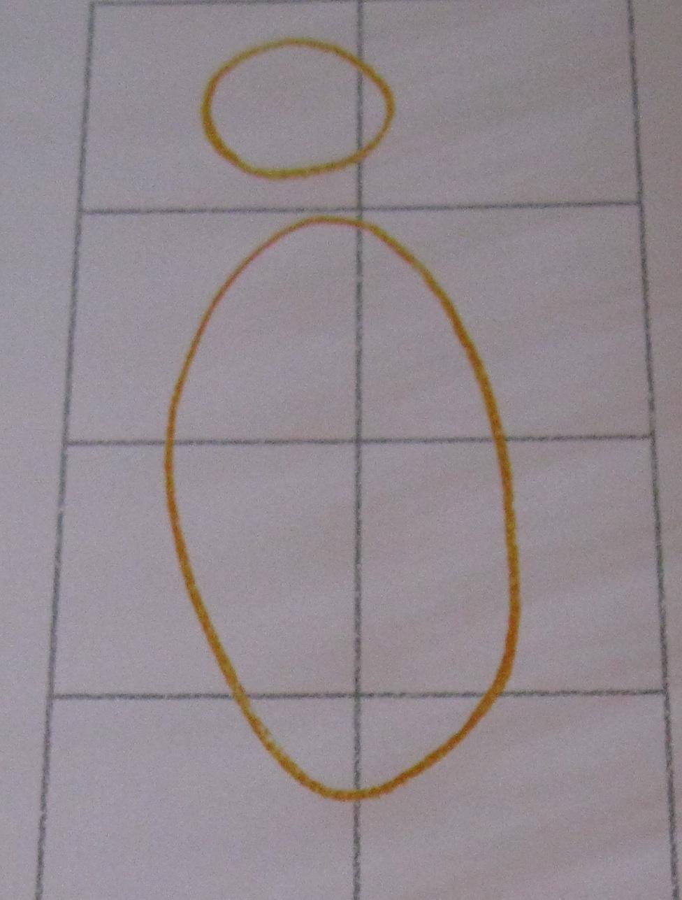 Dibuja una cuadrícula con dos cuadrados iguales horizontales y cuatro verticales. Traza la forma de la cabeza en la posición correcta de la cuadrícula. Esboza la forma del cuerpo y pasa al paso dos.