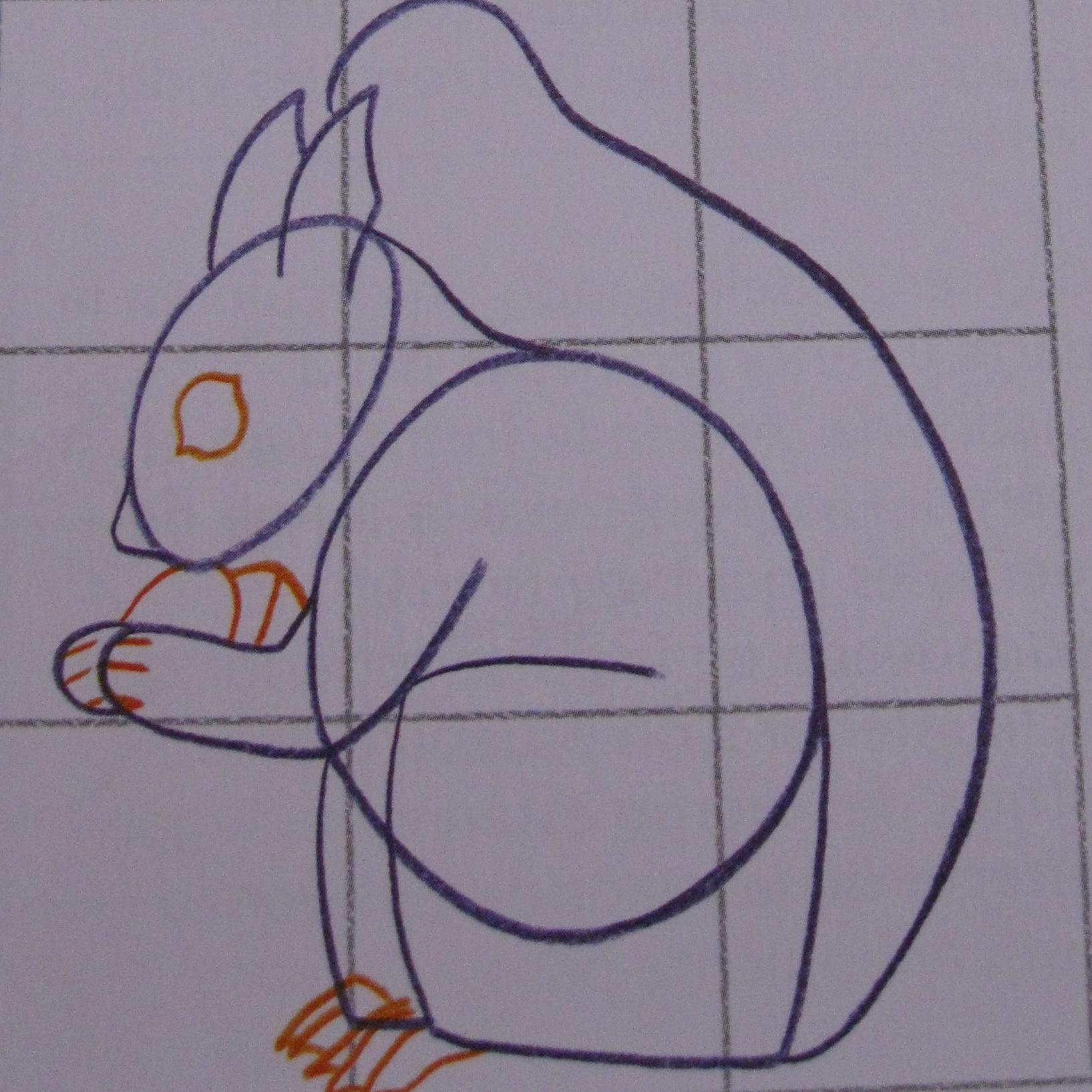 Dibuja un óvalo para la nuez que tiene entre las patas. Coloca luego una línea curva que vaya desde la parte superior de la nuez hasta el círculo de la cabeza para terminar en cuello. Añade la parte superior de la tora pata delantera debajo del cuello. Dibuja las garras de los pies en la base de la forma cuadrada que habías diseñado para las patas.