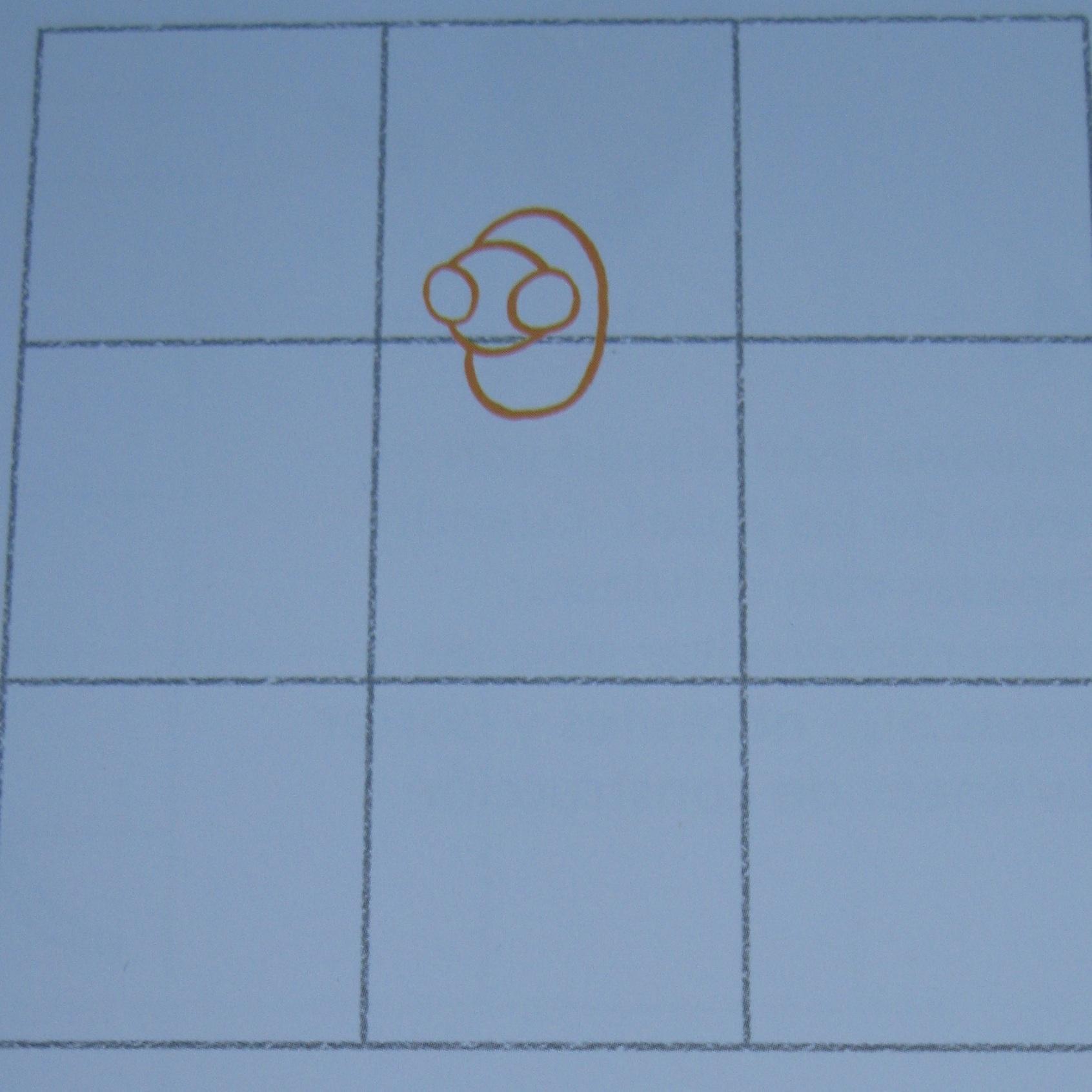 Comienza dibujando una cuadrícula con tres cuadrados iguales horizontales y tres verticales. Luego delinea la forma de los dos ojos pequeños. Añade el círculo de la cabeza por detrás de ellos. Completa por último con el gran óvalo para el cuerpo que hay detrás de la forma de la cabeza.