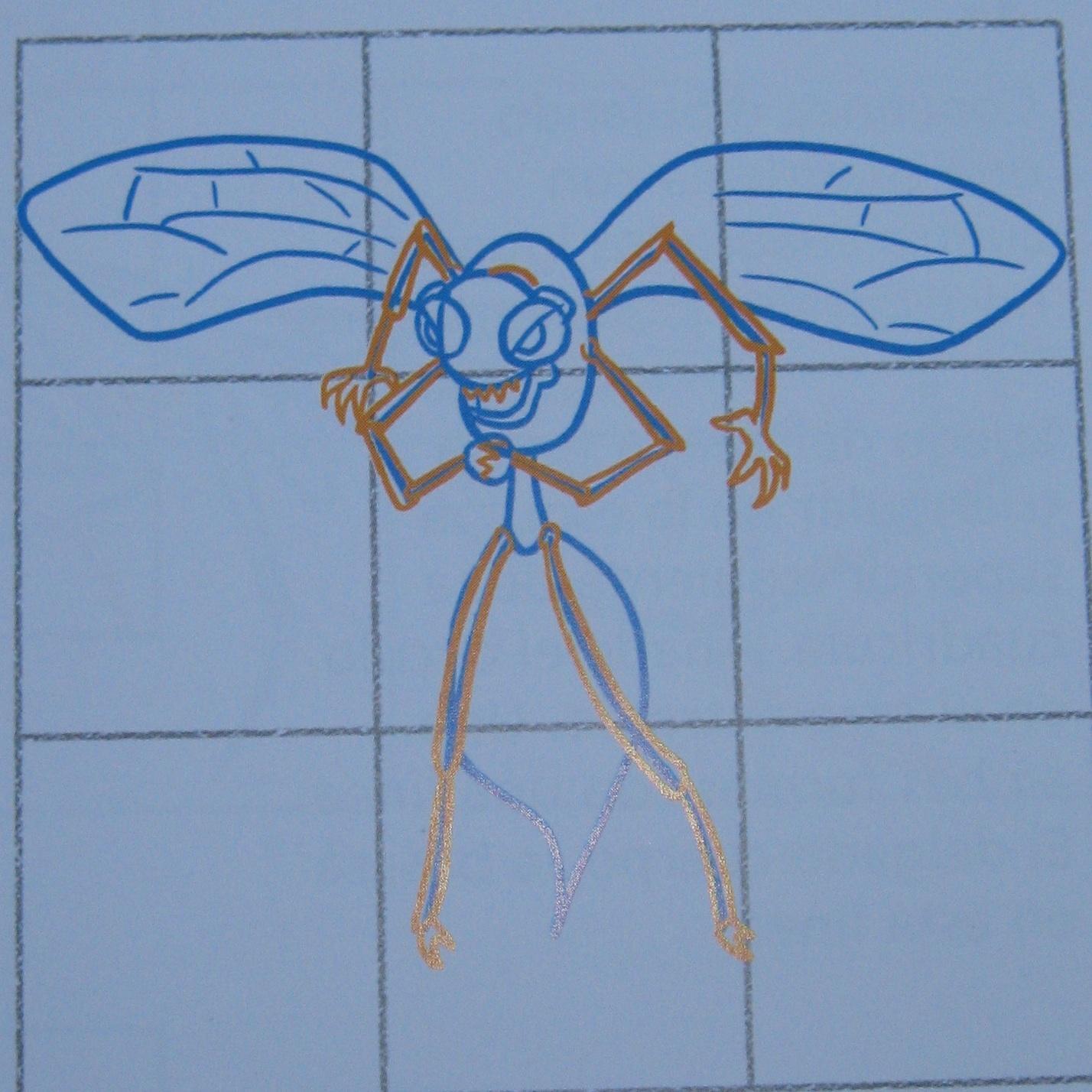 Aquí trazamos unas líneas para las seis patas. Construiremos las patas alrededor de estas líneas. Dibuja un círculo al final del par central de patas para las manos. Añade unas líneas para las alas. Termina con los detalles del rostro de la avispa.