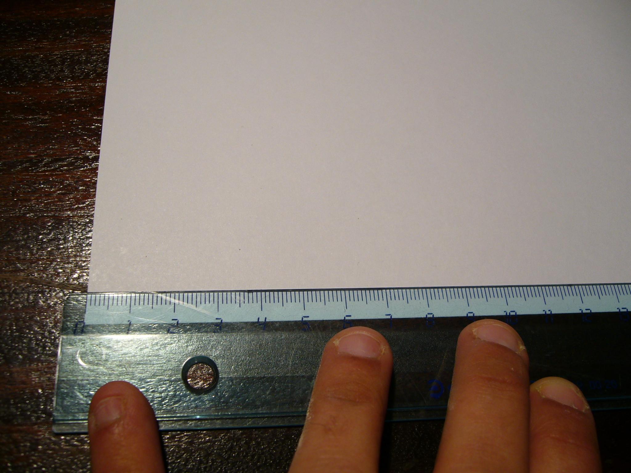 Con el folio encima de la mesa, coge la regla y ponla de tal manera que coincida el número 0 con el borde del folio. Ver imagen.