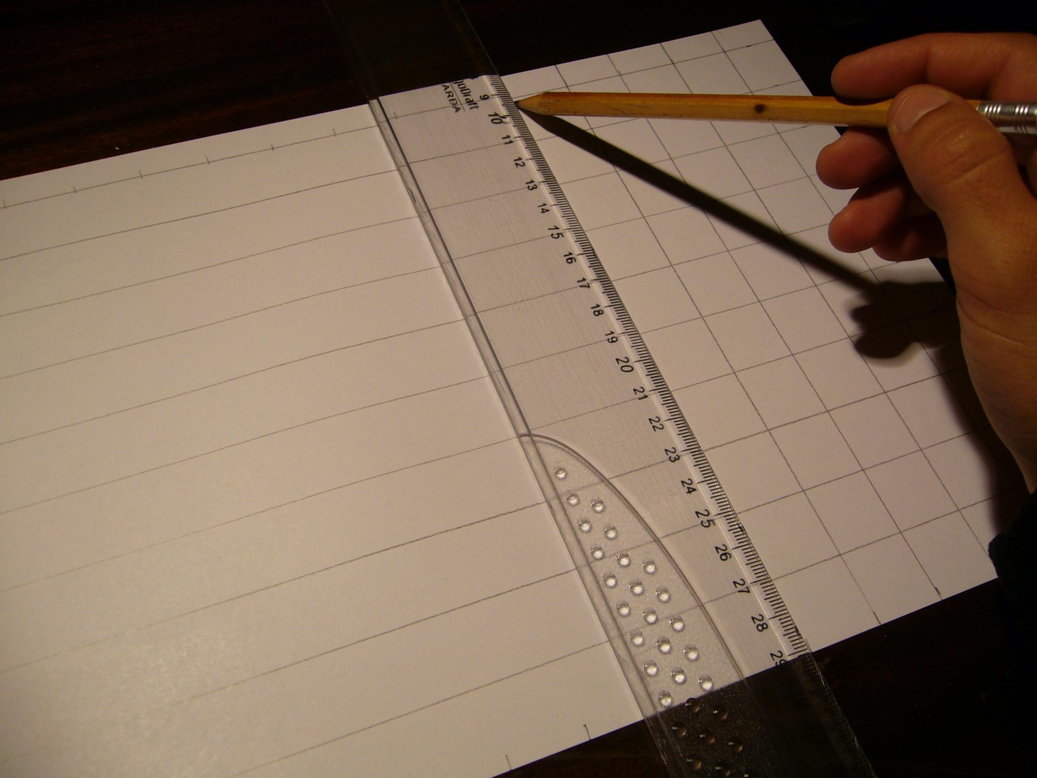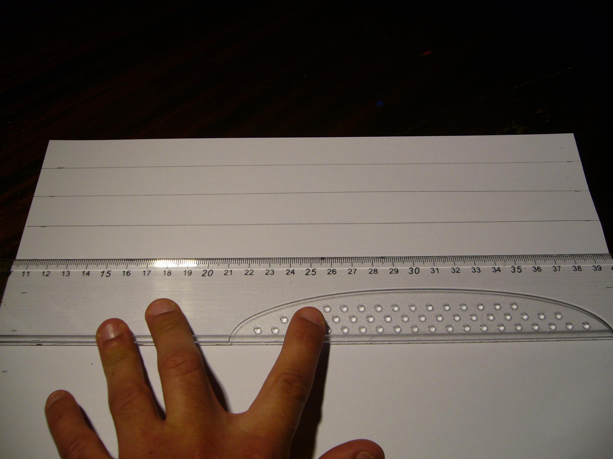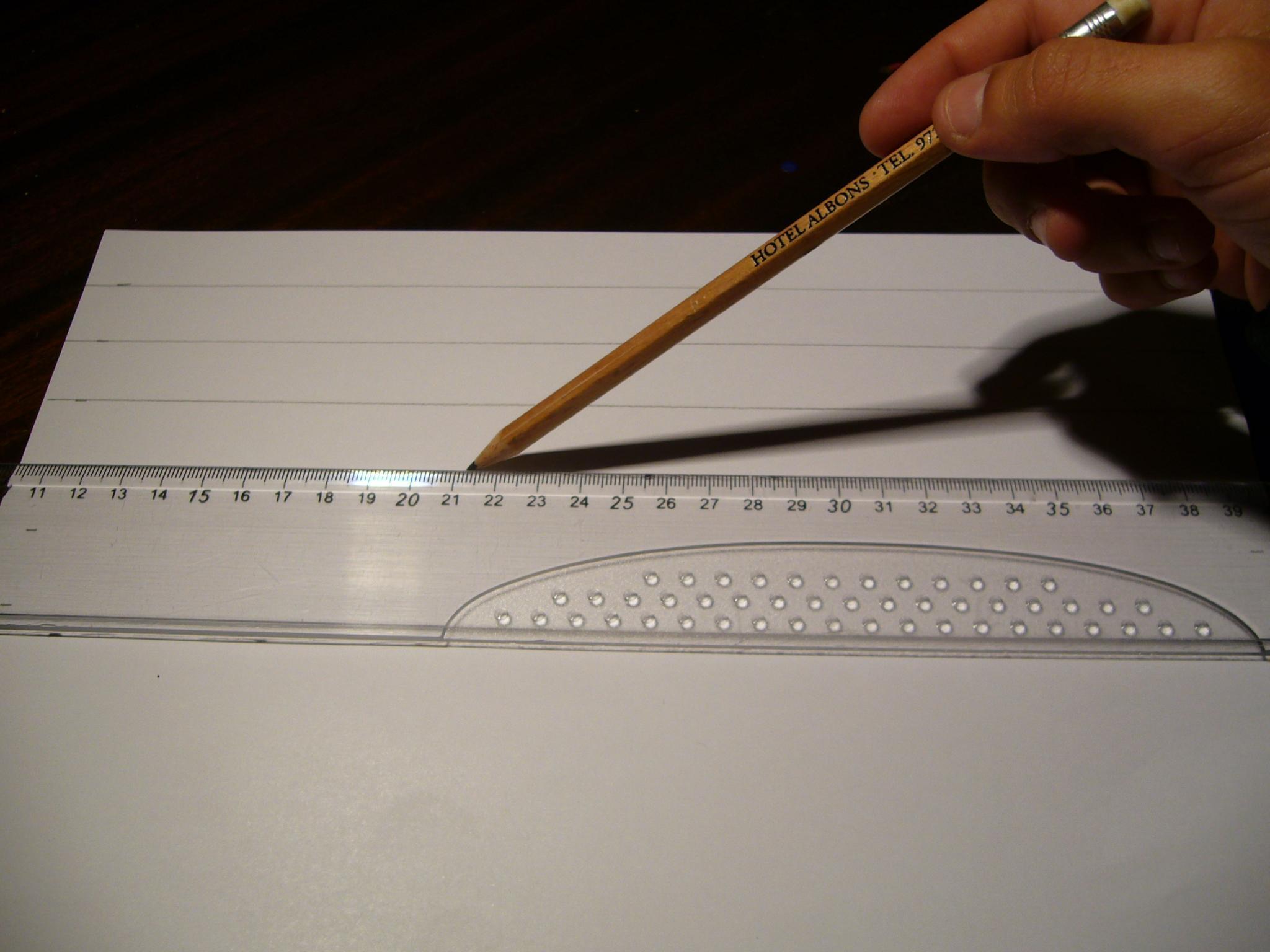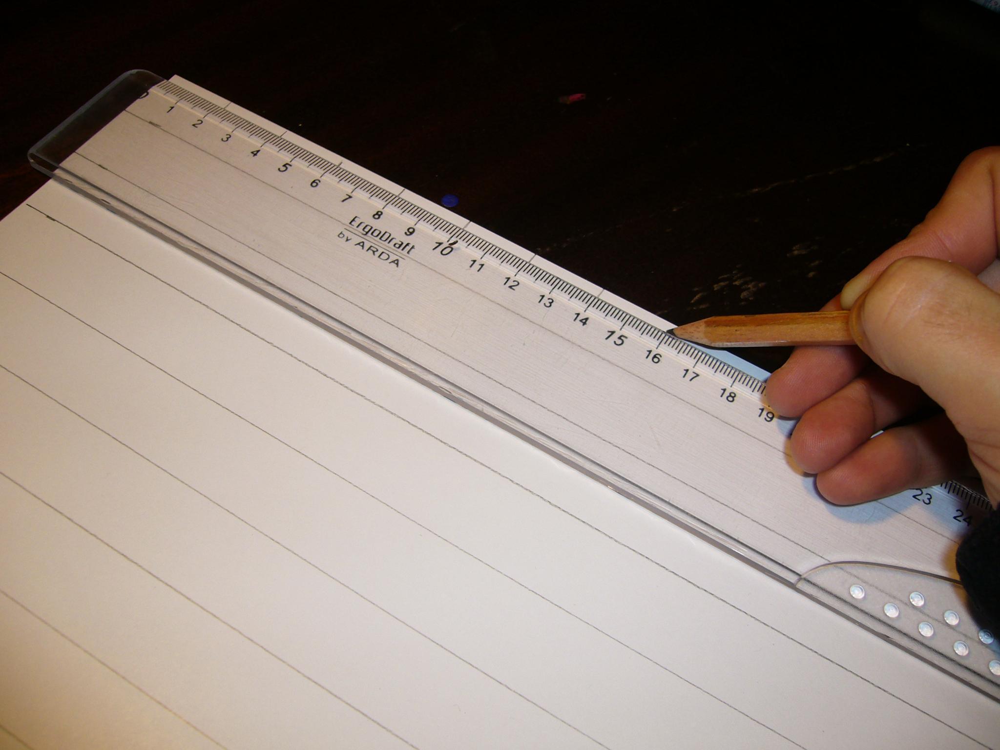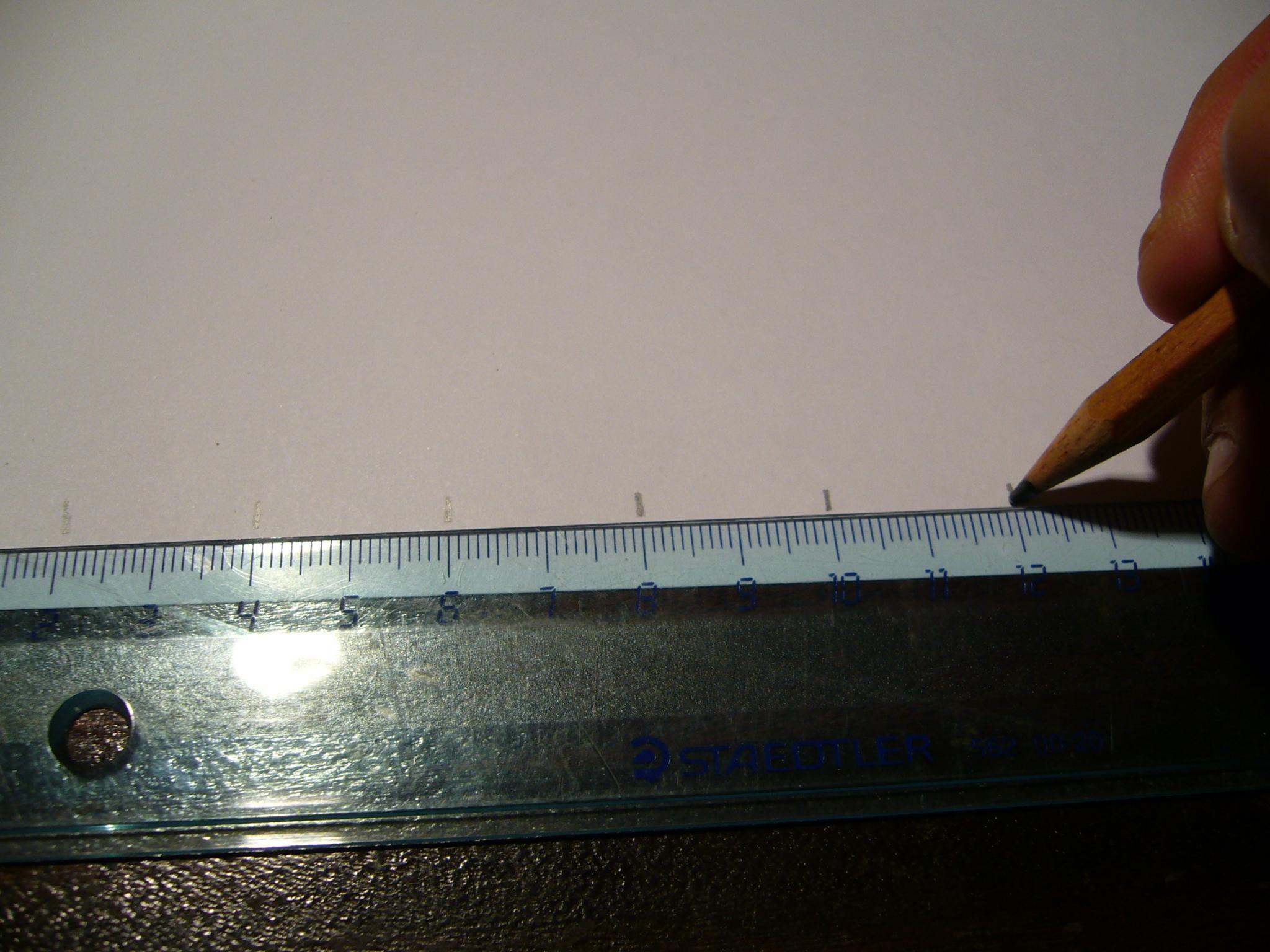 Con la regla junta las dos primeras marcas de lápiz del folio y traza la línia para juntarlas. Ver la foto.