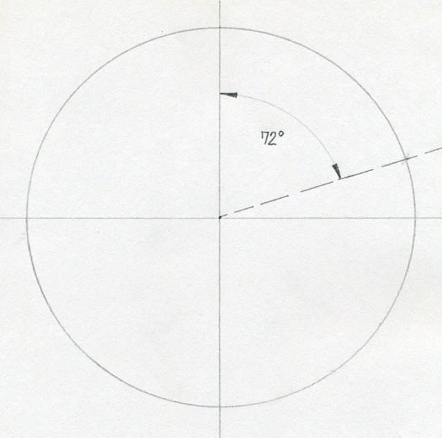 Divides el círculo en ángulos de 72 grados y obtienes 5 puntos en el círculo exactamente a la misma distancia unos de otros. Para dibujar una estrella se necesita una regla, compás y transportador. A partir de ahora, todo el trabajo de dibujo será con esas herramientas.