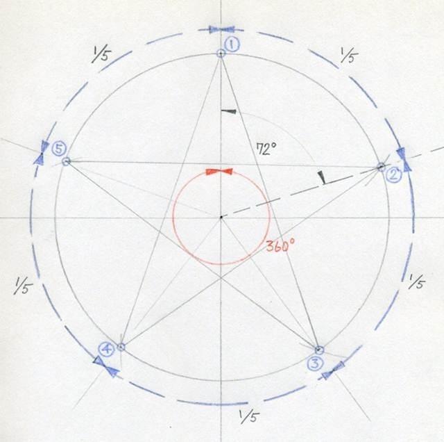 Vas a obtener 5 puntas (1, 2, 3, 4, 5) con una distancia exacta entre sí. En otras palabras, la distancia entre cada punto representa 1/5 de la longitud de la circunferencia.