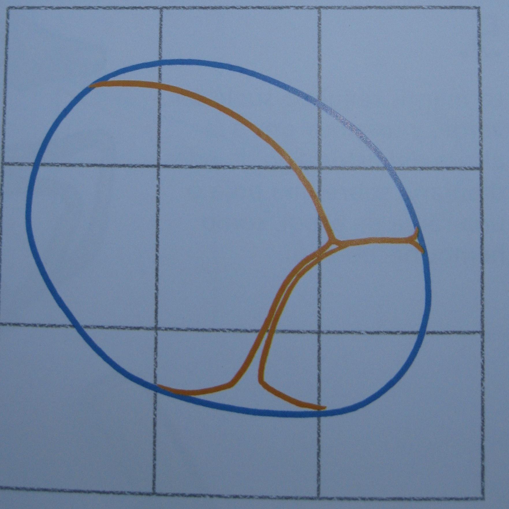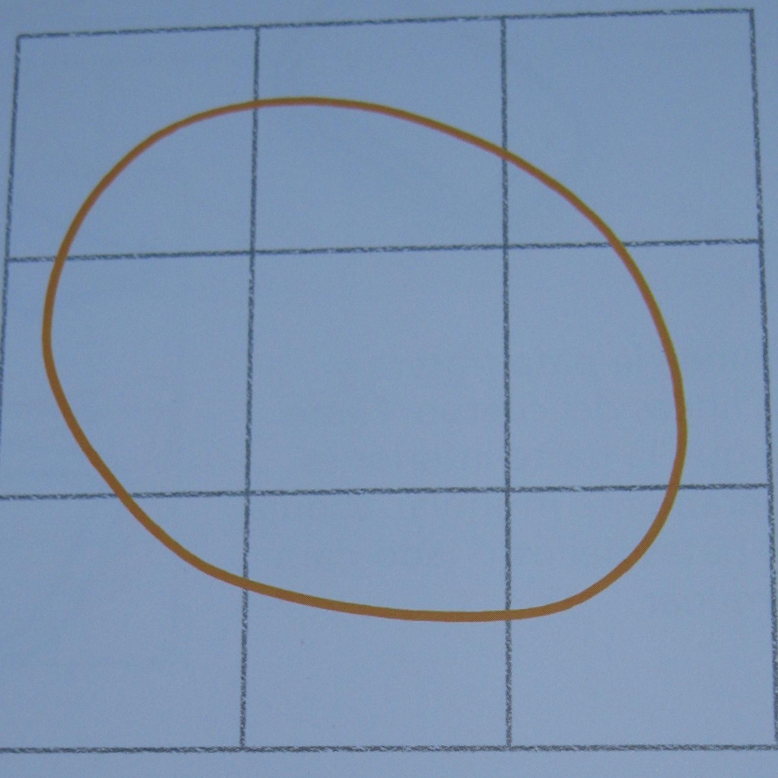 Comienza dibujando una cuadrícula con tres cuadrados iguales horizontales y tres verticales. Ahora delinea una forma circular. Fíjate bien en dónde está colocada en la cuadrícula.