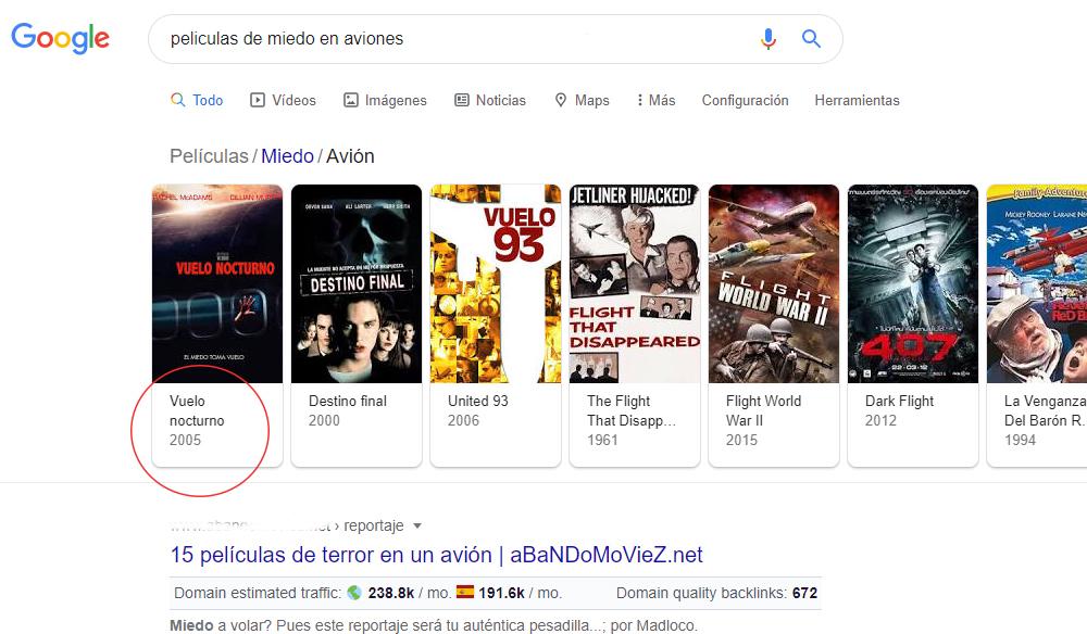 Pongamos un ejemplo: estamos buscando la película de terror/misterio del 2005 "Vuelo Nocturno" (Red eye en inglés) pero no sabemos dónde indagar. En este caso podemos buscar "películas de miedo en aviones" en Google y esperar a que el buscador nos arroje resultados de páginas web que incluyan información sobre películas que coincidan con la descripción.