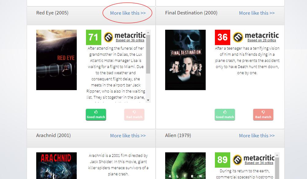 Además, esta web no te servirá solo para encontrar títulos concretos que ya andabas buscando, sino que también te recomendará películas a tu gusto, basándose en algunos films que ya te hayan llamado la atención. Hagamos un ejemplo con la misma película de antes: