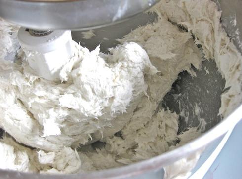 Lentamente agrega la mezcla de harina y agua a la pulpa de papel. Amasa hasta que tome mejor consistencia.