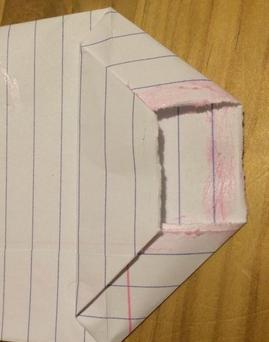 Juntaremos el otro lado de la mitad del folio y lo pegaremos al lado del pliegue como puedes ver en la imagen.
