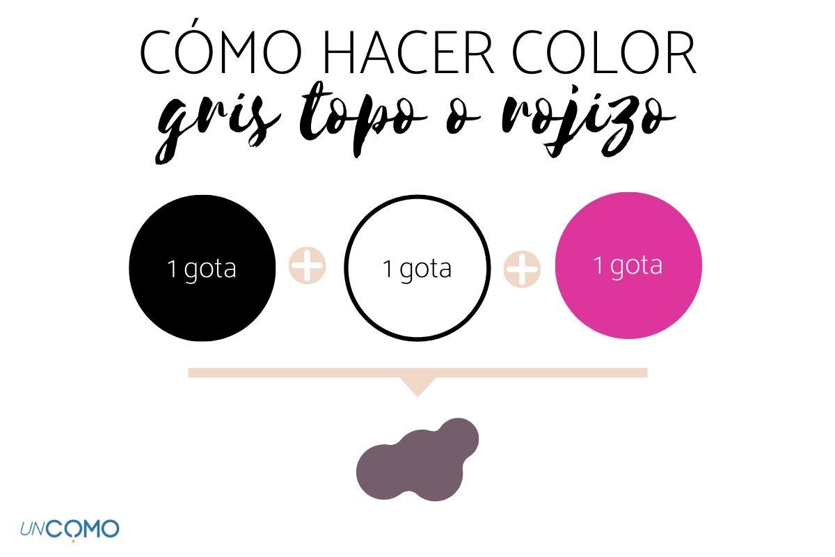En cambio, para hacer un gris cálido o rojizo como el color gris topo (un tono que se sitúa entre el gris y el marrón), añade una pequeña cantidad de magenta o rojo (según el material que tengas) a la mezcla de blanco y negro. Aquí puedes aprender Cómo hacer color rojo.