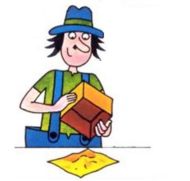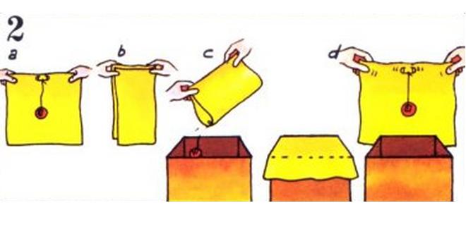 Luego levanta el pañuelo con la bolita hacia ti (a). Dobla el pañuelo por la mitad (b). Arroja la bolita en la caja ©. Deja caer el pañuelo sobre la caja (d).