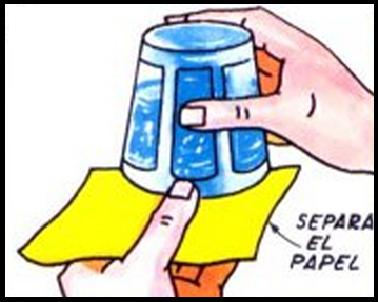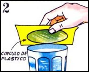 Después para hacer el juego, esconde el circulo de plástico bajo el trozo de papel duro. Llena el vaso. Sujeta el círculo bajo el papel y colócalo sobre el vaso.