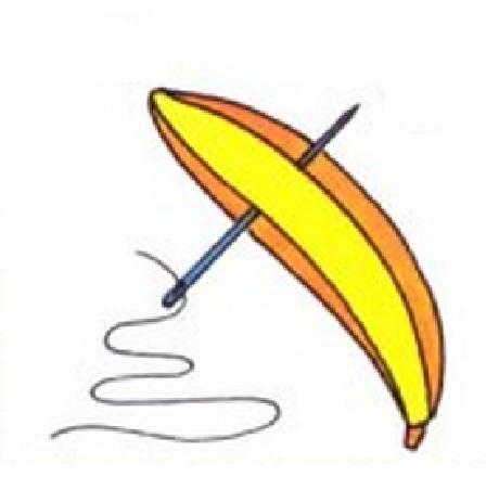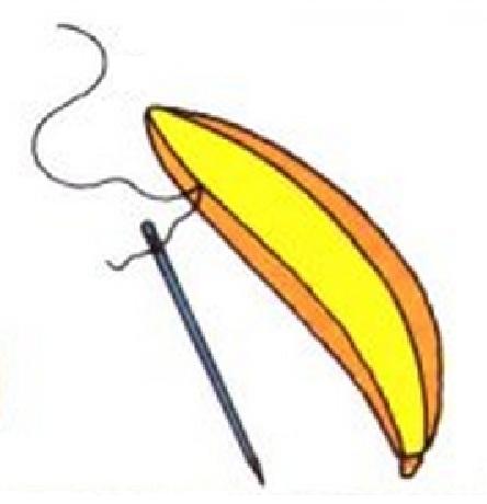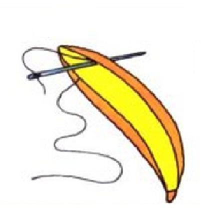 Primero de todo pon 30 cm de hilo grueso en una aguja. Atraviesa con la aguja uno de los lados planos de un plátano grande.