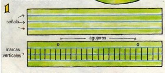 Primero de todo dibuja tres líneas a lo largo de un rectángulo de papel según se indica en el dibujo. Después traza rayas verticales entre ellas. Haz dos agujeros en la parte superior a medio camino entre los extremos y el centro.