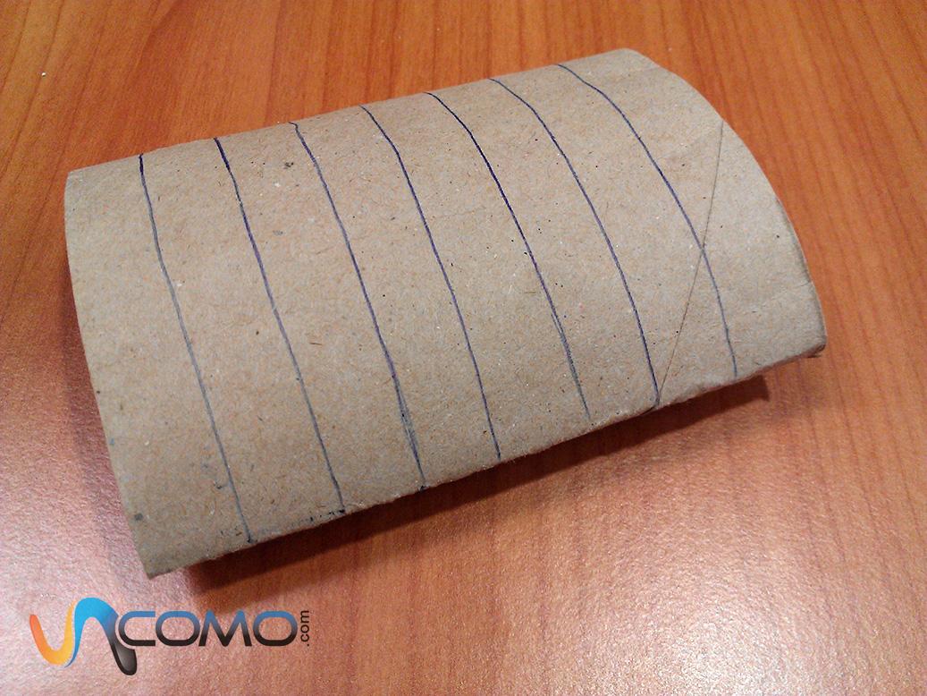 A continuación, recorta el tubo de papel higiénico por las líneas trazadas con la ayuda de unas tijeras.