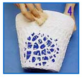 Luego aplica con una espátula, una capa pareja de cemento blanco para utilizarlo como adhesivo. Compone el diseño, desde el centro hacia afuera, presionando los trozos de azulejo sobre la superficie con una separación de 5 mm entre uno y otro.