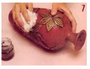 Sobre el jarrón aplica abundante engrudo en el lugar donde se pegarán los pétalos todavía húmedos. Pégalos de uno y luego pincela los pétalos con engrudo para fijarlos.