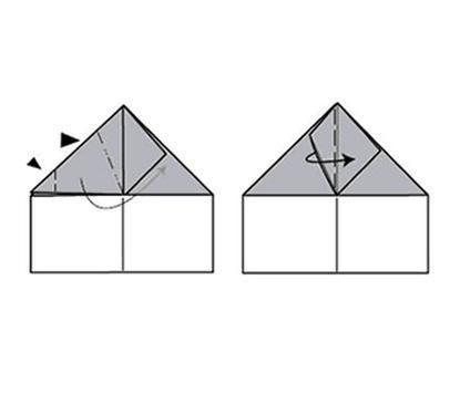 A continuación, mediante los pliegues realizados anteriormente, doblas la hoja de papel de modo que te quede una forma parecida a una casa, luego dobla la esquina derecha hasta la punta superior de la caseta. Ver imagen.