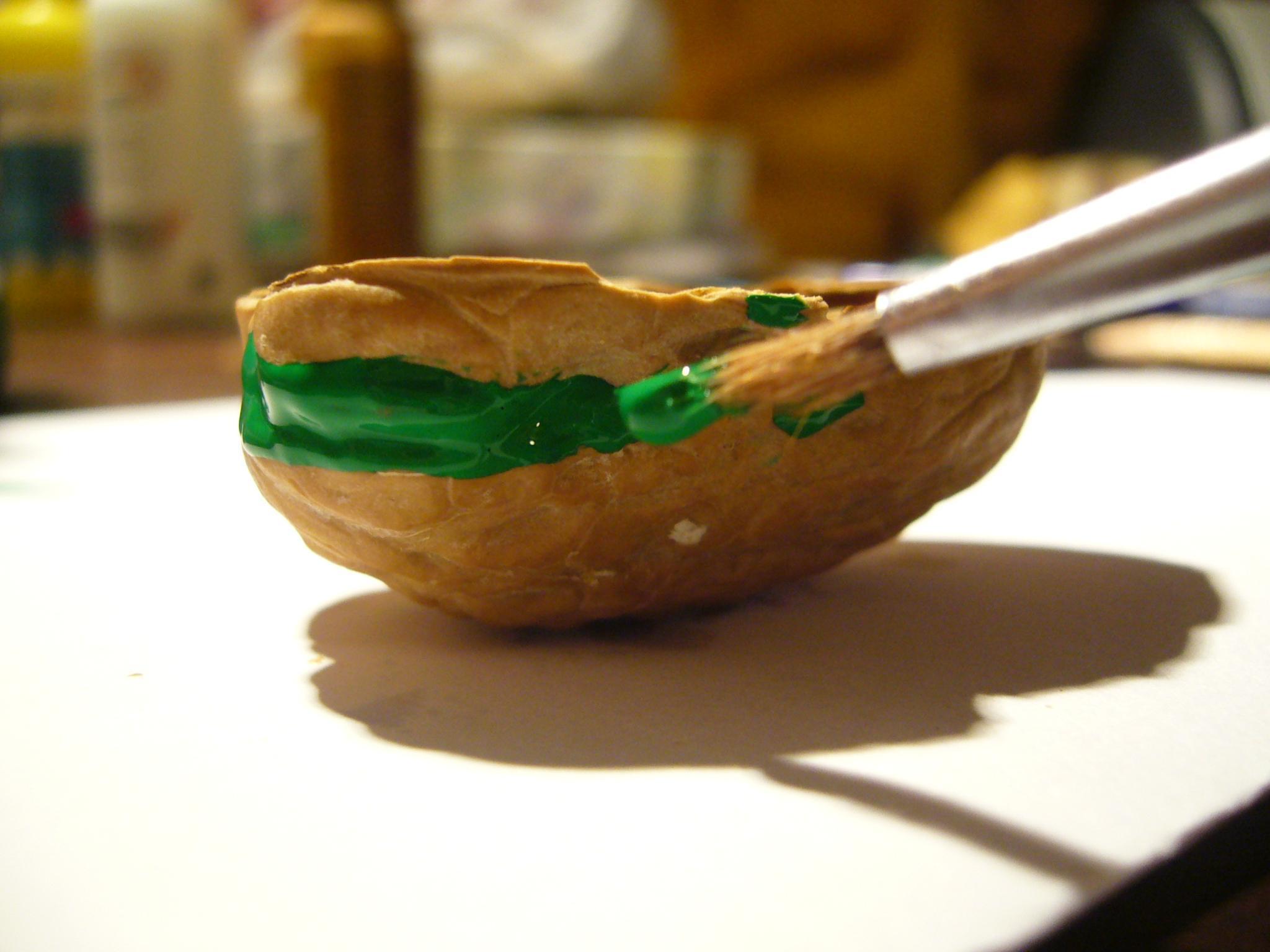 Pinta una ralla de color verde por todo el contorno de la nuez. Observa la imagen.