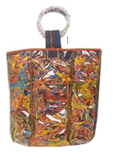 Rellena las 3 divisiones del nylon con restos de lanas diferentes. Corta una tira de jean de 2cm de ancho para ribetear el borde de la abertura de la cartera. Apoya sobre el derecho y dobla la mitad hacia adentro, únela a la cartera con puntada zig-zag. Para cada manija corta 2 tiras de jean de 10 x 4xcm. Enfréntalas por el revés y cose por los bordes de los lados más largos. Da la vuelta a la pieza y pasala por el centro de la arandela. Une a la cartera cosiendo sus extremos al interior de ésta. Cose el fuelle por el revés cerrando con costura recta.