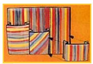 Para hacer los bolsillos corta las 4 tapas en tela rayada. El rectángulo más grande servirá para aplicar los bolsillos más pequeños. Realiza las marcas con lápiz por el revés de la tela. Dobla hacia adentro el margen superior de cada una de las tapas y pegalas con pegamento para tela. Dobla los bolsillos por sus fuelles. Ubicalos sobre el rectángulo base de forma escalonada. Hilvana y pespuntea