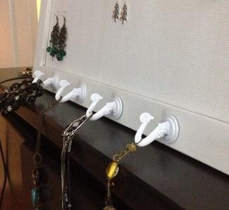 Para darle un toque muy original al porta joyas puedes poner en la zona inferior del marco unos cuantos colgantes de colgar la ropa, los usaremos para colgar collares. Usa colgadores estilo vintage, son los que más de moda está y te quedarán genial.