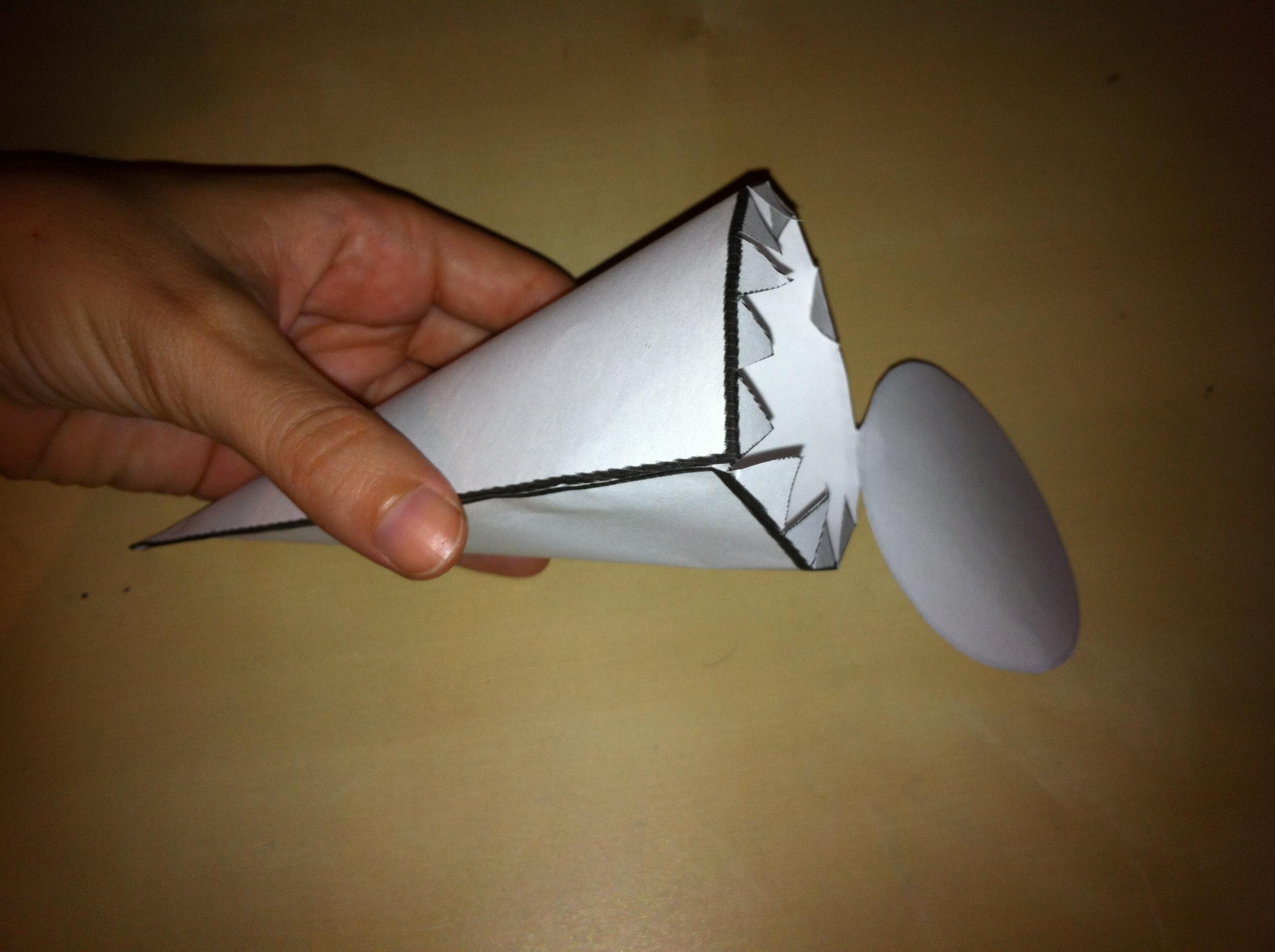 Ya tienes el cucurucho hecho. Ahora pon pegamento en las pestañas pequeñas (triángulos) y pega la base del cono. Para que sea más fácil gíralo para hacer peso sobre las pestañas.