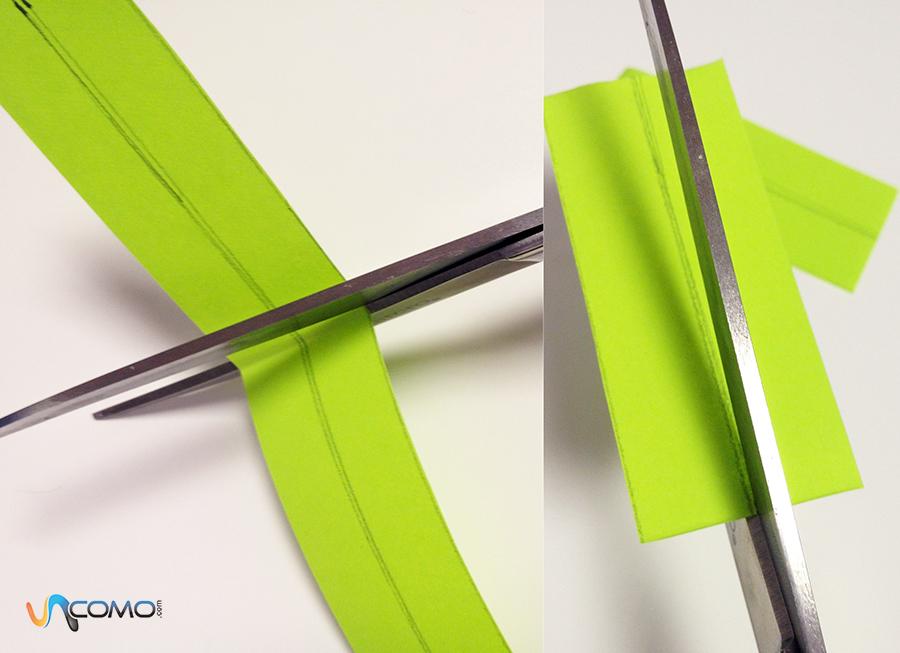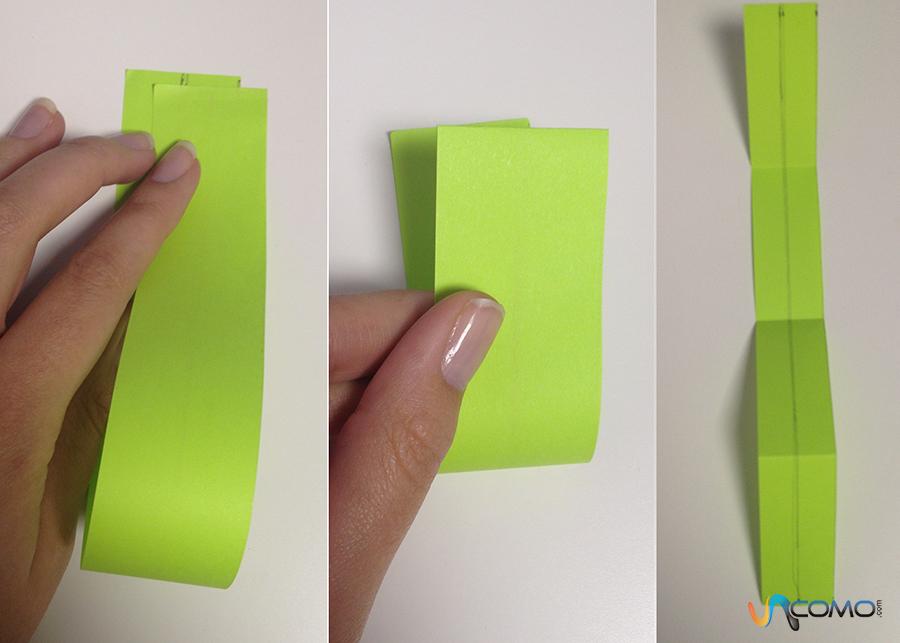 Cuando tengas la tira cortada, coge el extremo inferior y llévalo hacia el superior para doblarla por la mitad, fíjate en la fotografía. Cuando la tengas doblada, vuelve a hacer lo mismo para plegar la tira de nuevo por el centro. Es importante que marques bien con los dedos las dobleces puesto que una vez doblada por segunda vez, debes desdoblarla.