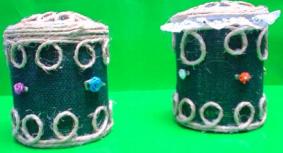 Para empezar se forra el tarro con la tela o yute. Luego adorna la parte inferior con una vuelta de soguilla, y la segunda vuelta se va formando ondas u otras figuras, lo mismo se hace con la parte superior.