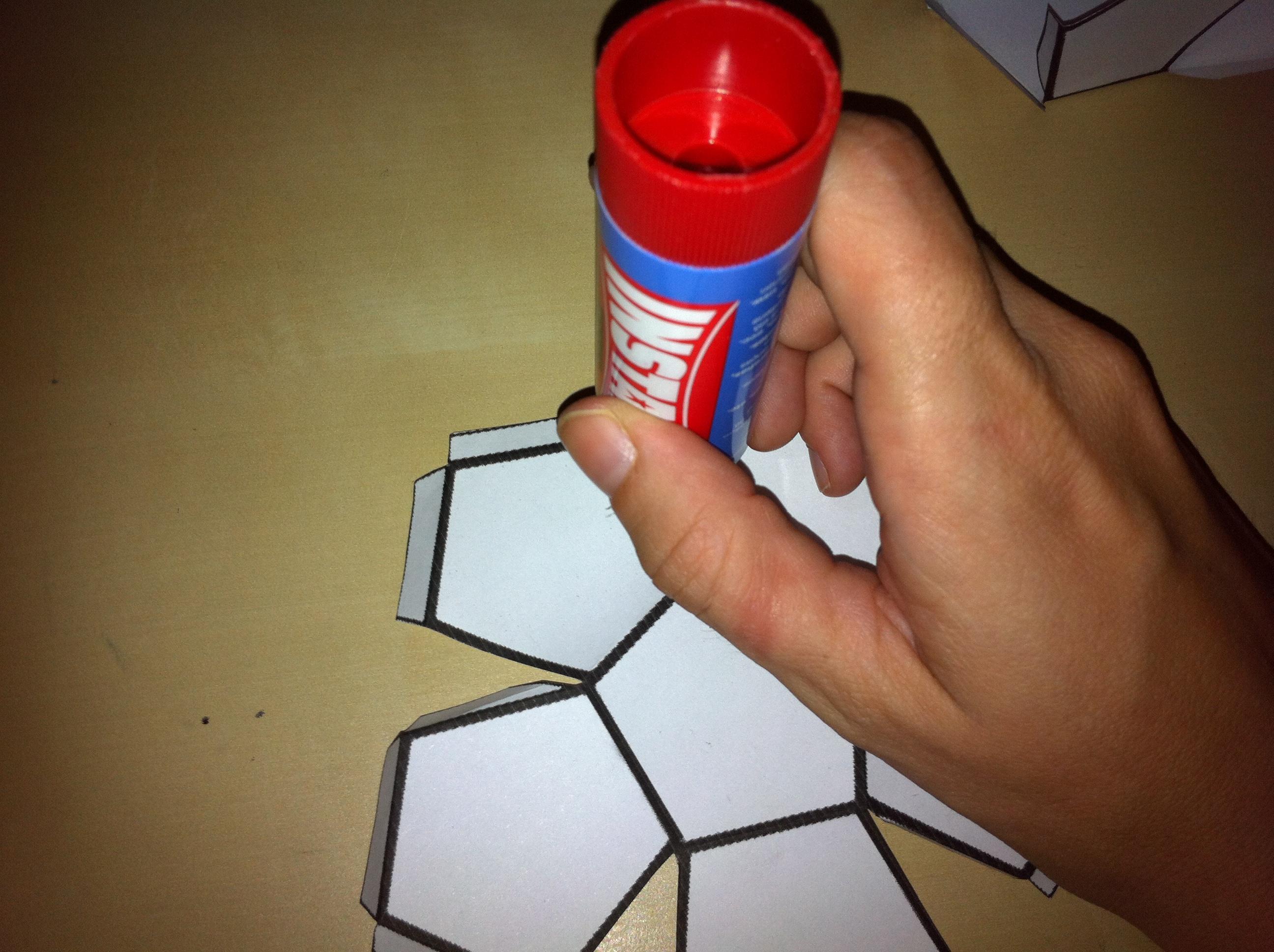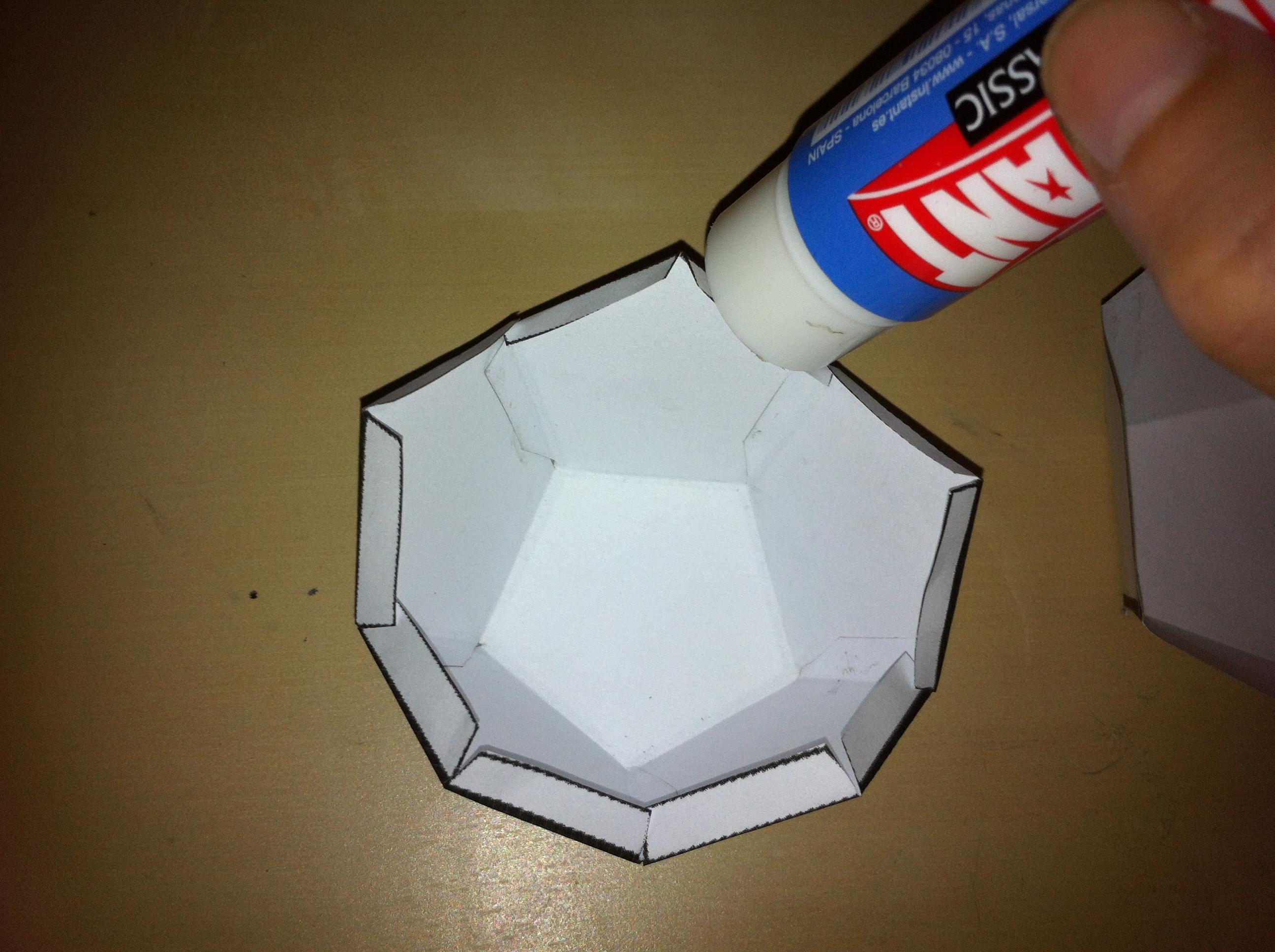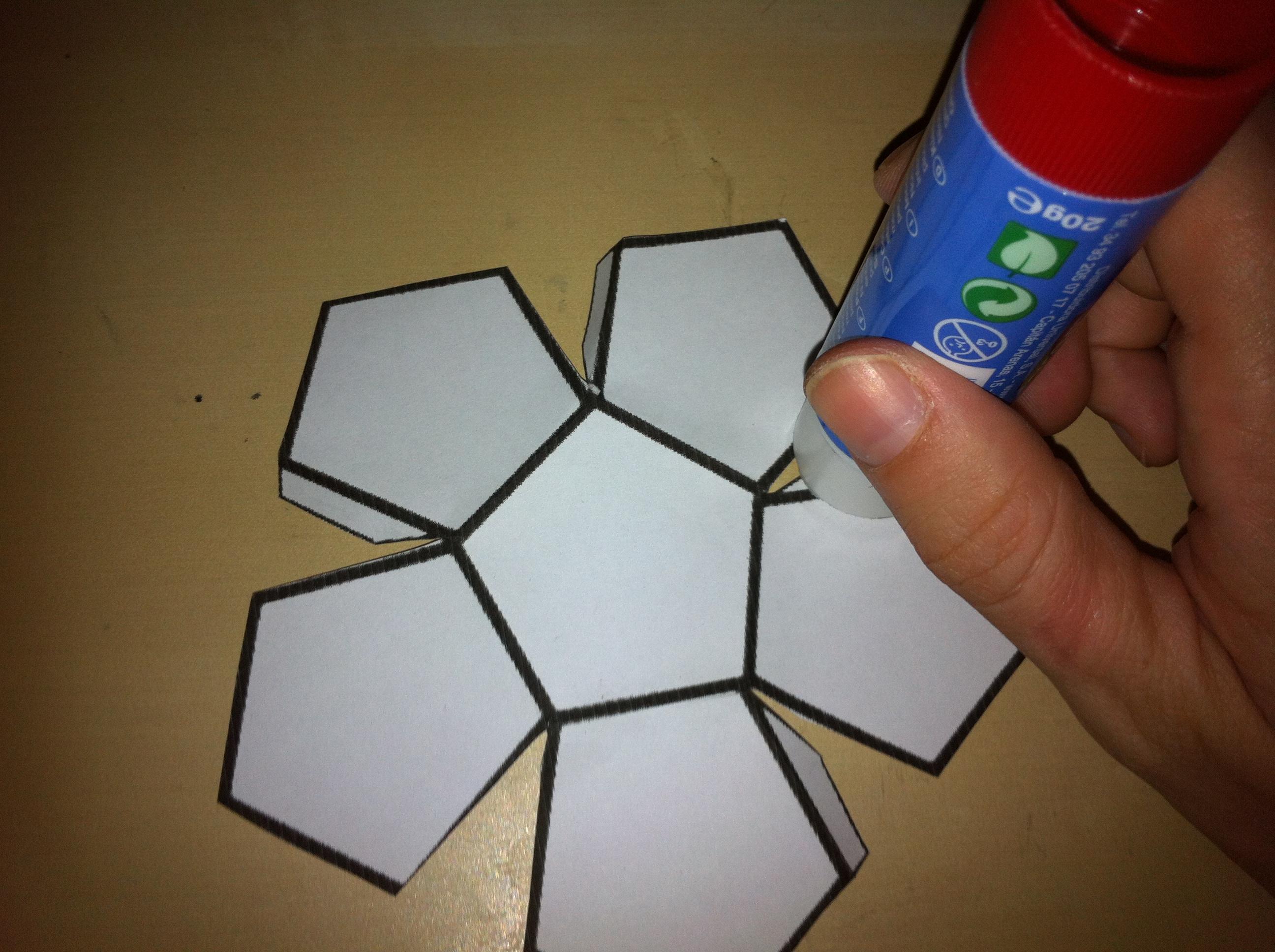 Ahora pon pegamento en las pestañas que quedan y une con la otra mitad del dodecaedro. Si te resulta difícil que se pegue, pon pegamento también en la otra parte del dodecaedro para que sea más senzillo.