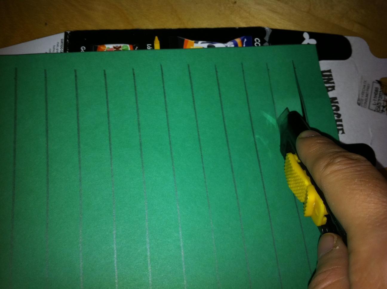 Recorta el papel o cartulina y traza unas líneas verticales como te mostramos en la imagen. Haz cada línea a 1,5cms de las otras. Utiliza un cutter para cortarlas.