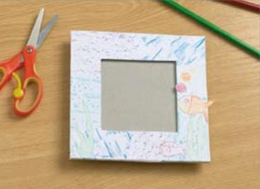 Luego pintas trozos de papel de muchos colores distintos aplicando la técnica del frottage en diferentes superficies, y forramos el marco y el dorso (teniendo en cuenta que debes dejar libre la zona que ha dejado hueca el cartón en forma de U).