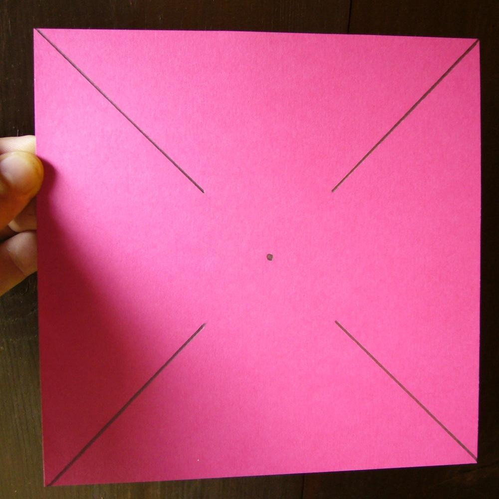 Con la ayuda de una regla traza las dos diagonales, pero que las líneas no lleguen al punto central. Marca el centro del cuadrado.