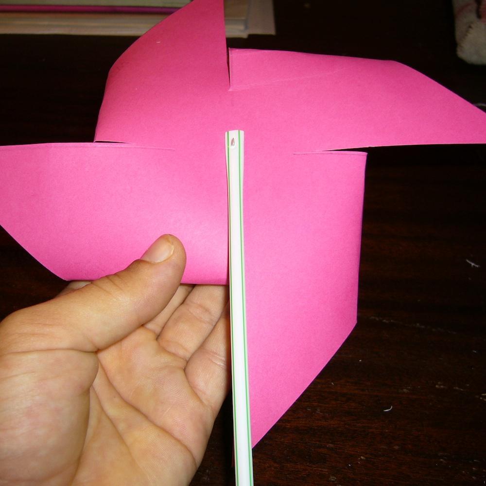 Pasa la chincheta por los agujeros de las 4 puntas del molino de viento. Y por detrás del molinillo pon la pajita de tal manera que la chincheta pinche también la pajita.