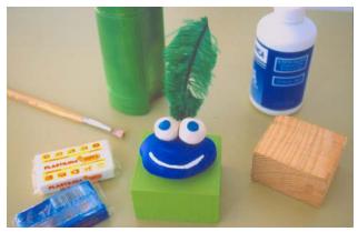 Primero de todo tienes que empezar pintando el taco de madera con témpera de algún color vivo. Elige el color que más te guste o el que tienes por casa.