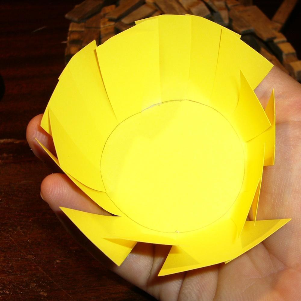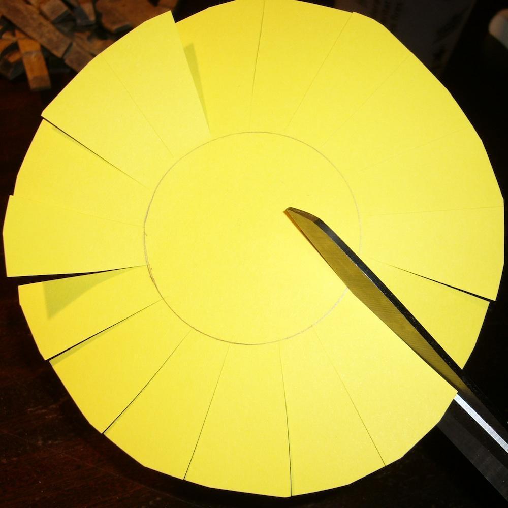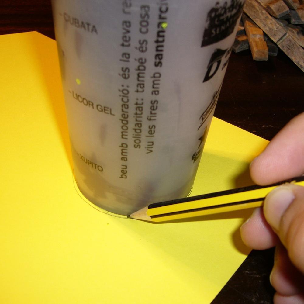 Recorta la cartulina de forma redonda y ve haciendo pestañas alrededor del círculo que has hecho con el vaso.