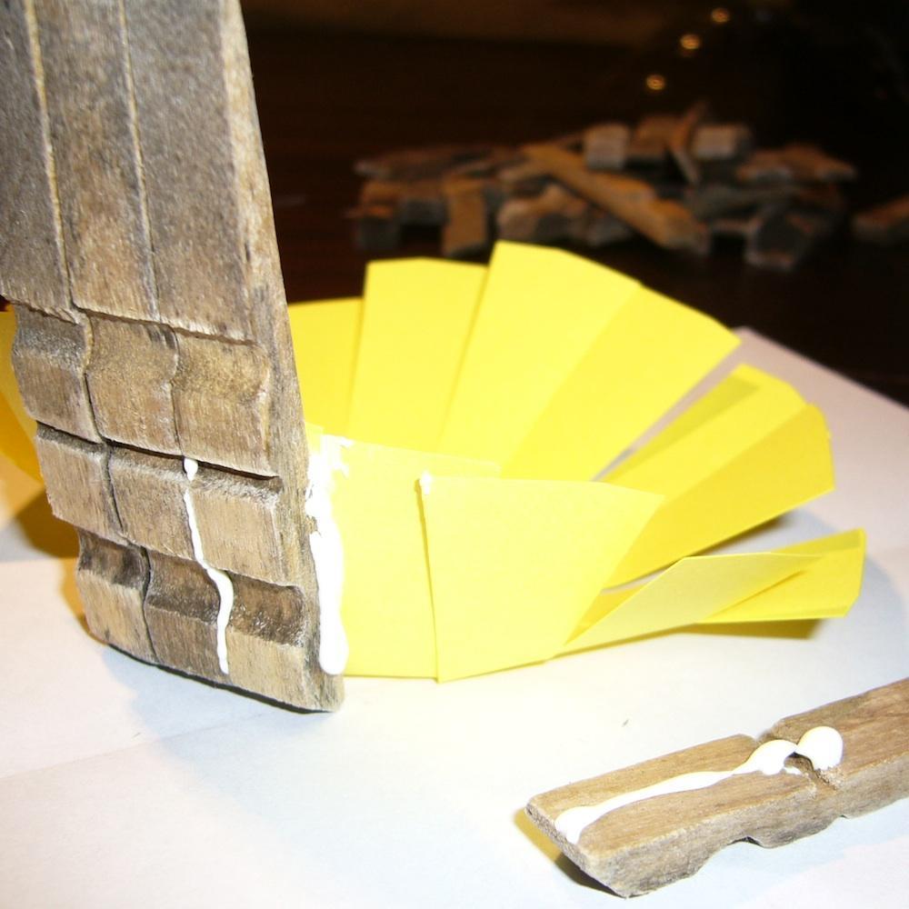 Ve pegando las pinzas de tender la ropa en las pestañas que has recortado en el paso anterior.