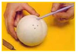 Primero de todo forra con masa de porcelana fría la esfera plástica colocando previamente cola vinílica para que no se adhiera. Cierra la abertura con masa dejando un espacio libre de la medida de la tapa de plástico. La tapa de plástico serpa la base que sustente la pieza y permitirá reponer la sal o pimienta.